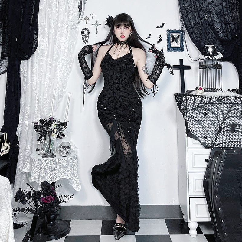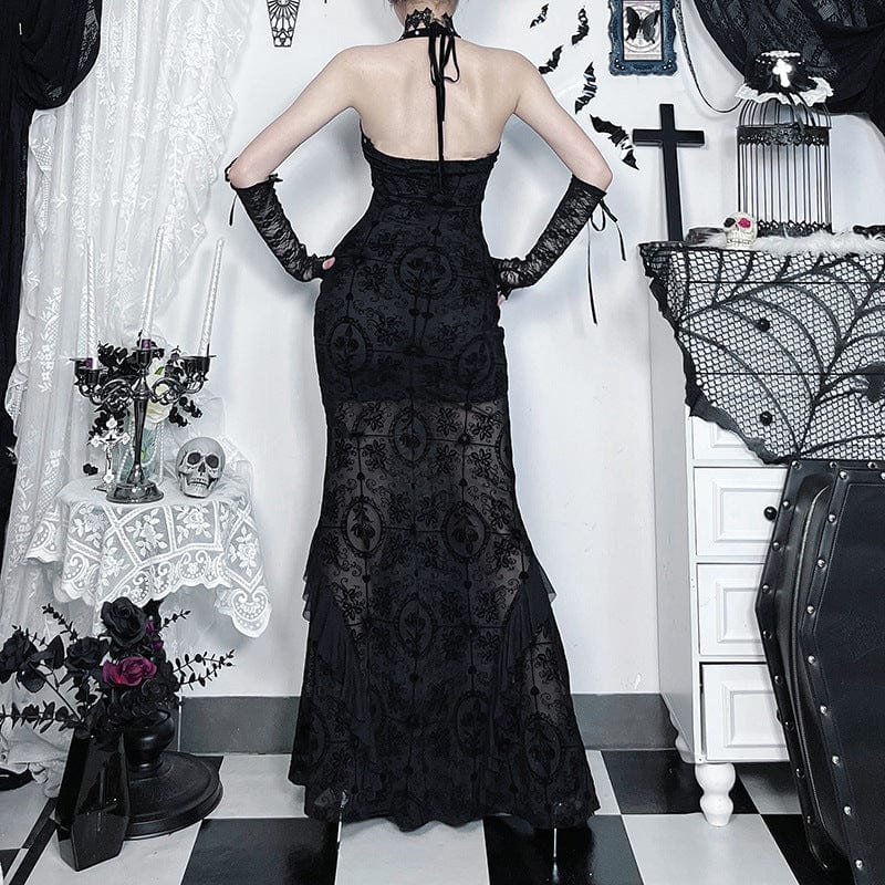 Abito a coda di pesce in rete floccata con scollo all’americana da donna in stile gotico