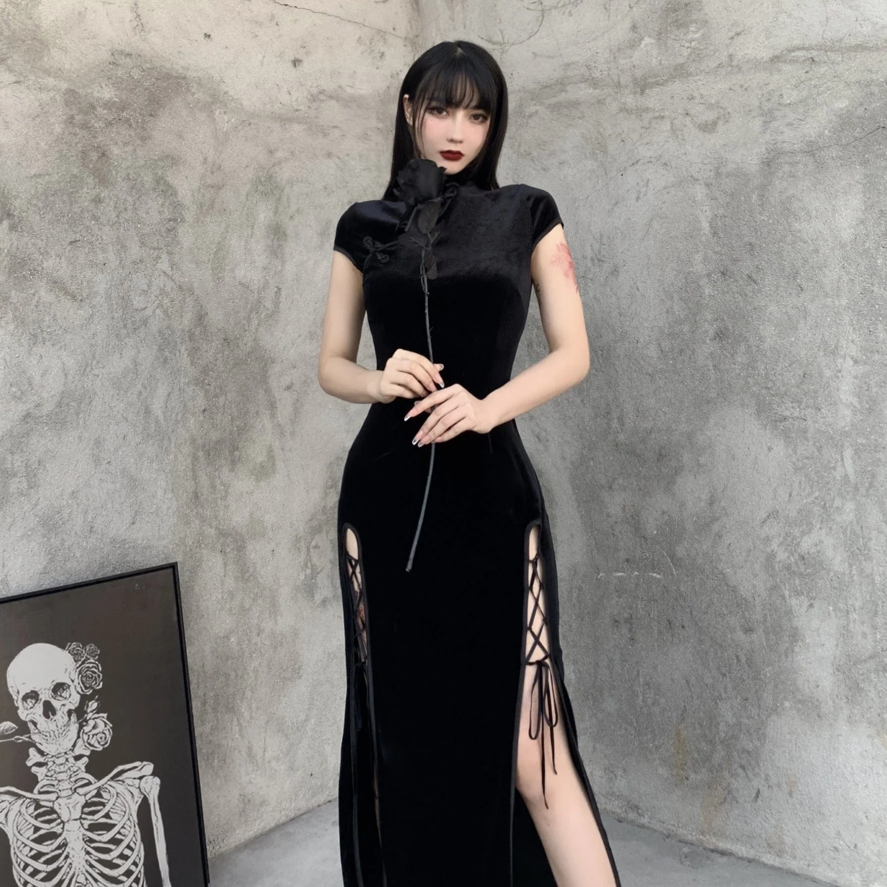 Recensisci per primo “Abito cheongsam in velet nero con spacco laterale gotico da donna”