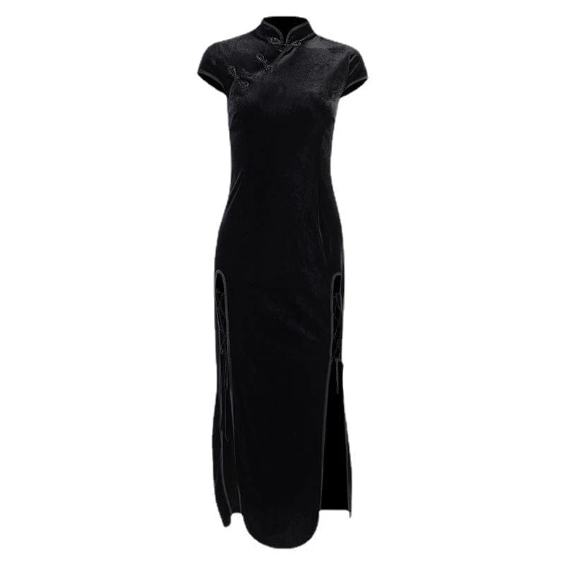 Abito cheongsam in velet nero con spacco laterale gotico da donna