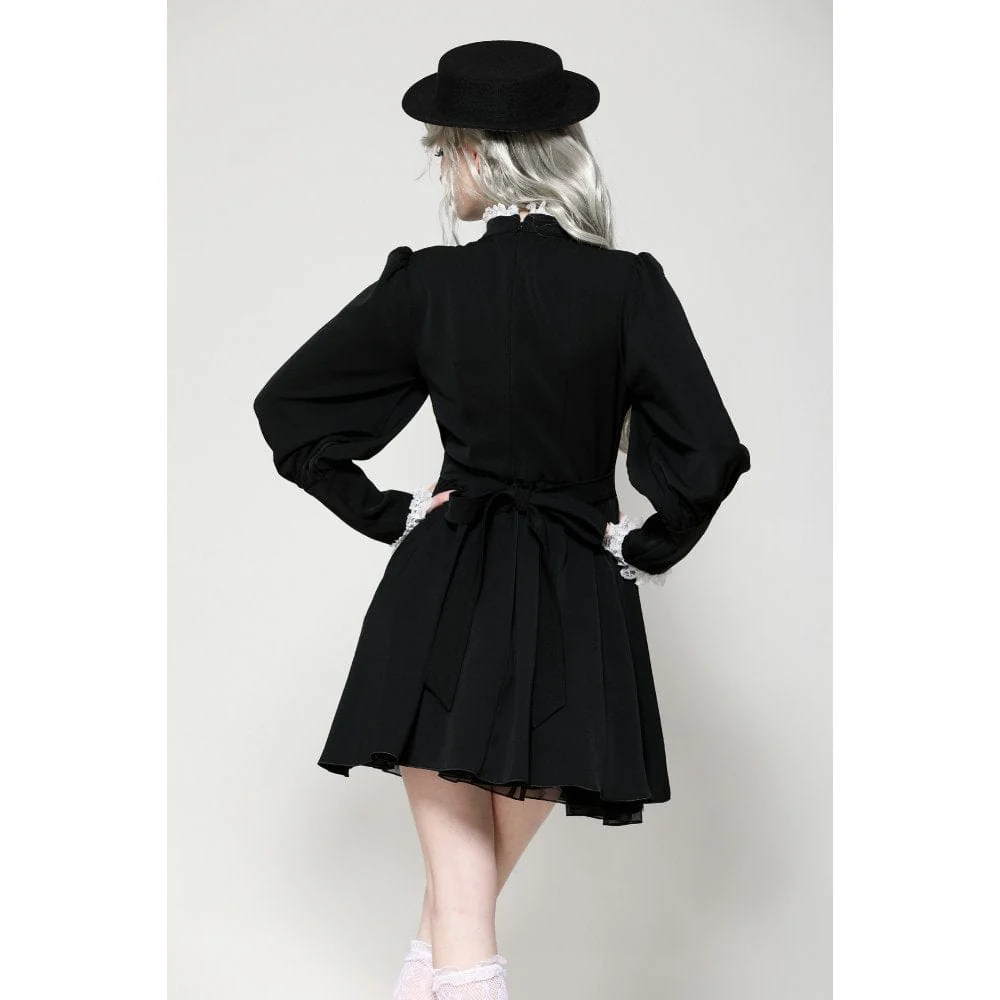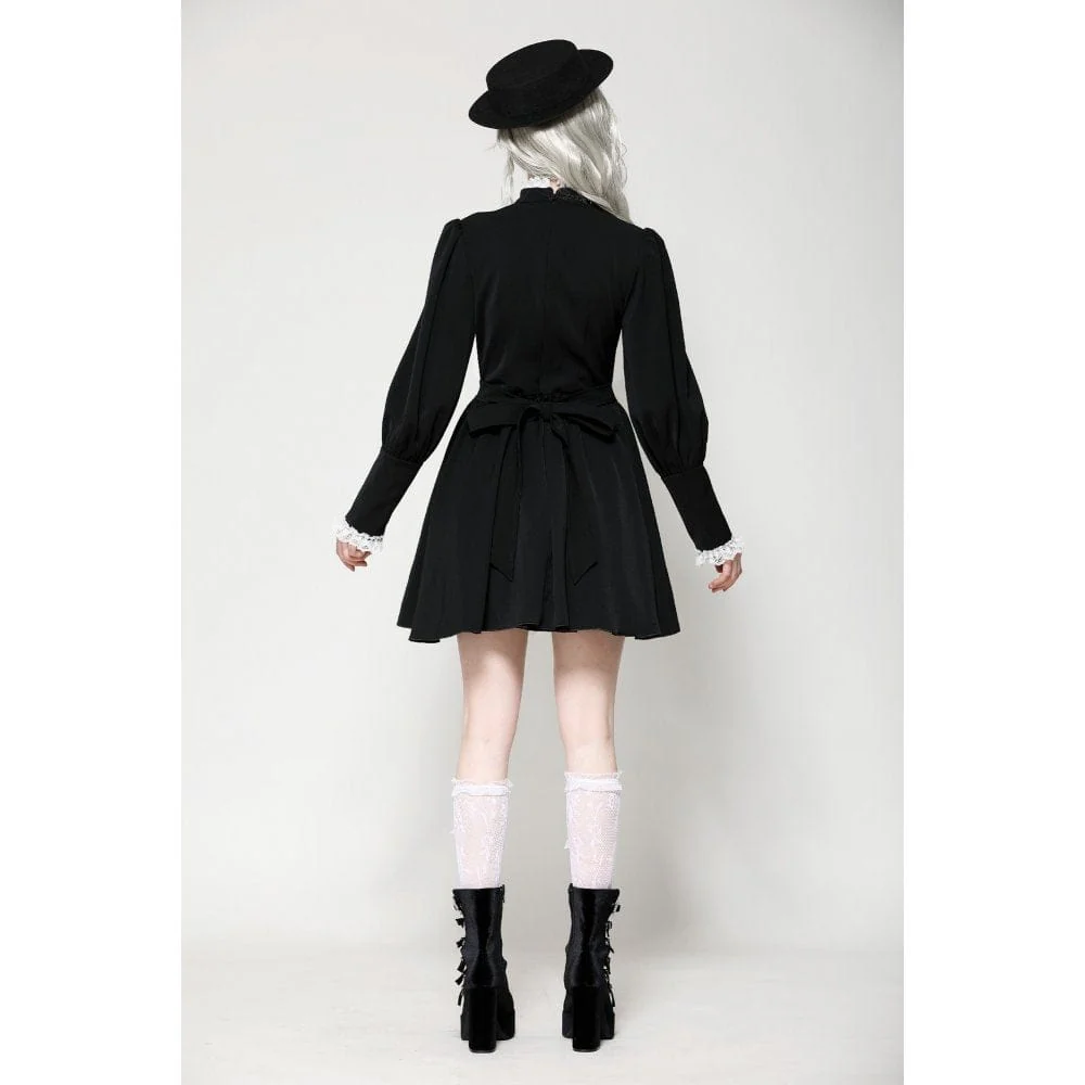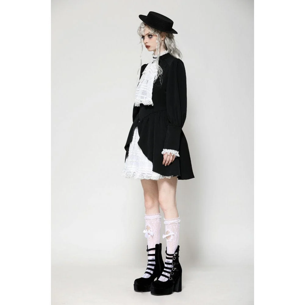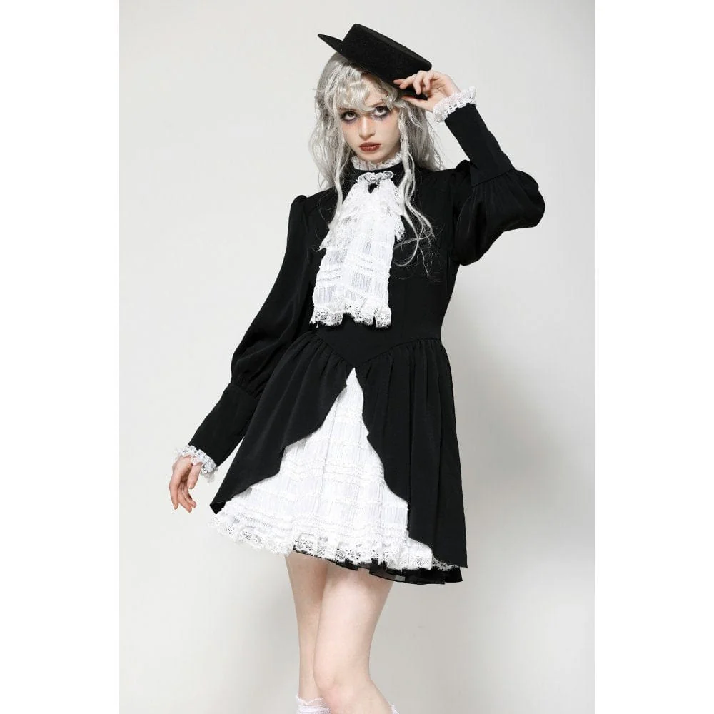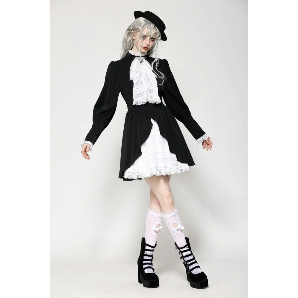 Questo abito a contrasto bianco e nero è un perfetto mix di eleganza vittoriana e fascino gotico. L’intricato pizzo sulla scollatura, abbinato a una delicata pietra preziosa ragno, aggiunge un’aria di mistero. Le maniche a sbuffo a gamba di montone esaltano il suo fascino vintage, mentre il tessuto bianco plissettato sull’orlo offre una ricca profondità visiva. La vita presenta un fiocco regolabile, che consente una vestibilità personalizzabile, aggiungendo un tocco di grazia femminile. Che sia per l’uso quotidiano o per le occasioni speciali, questo abito ti renderà sicuramente il centro dell’attenzione.