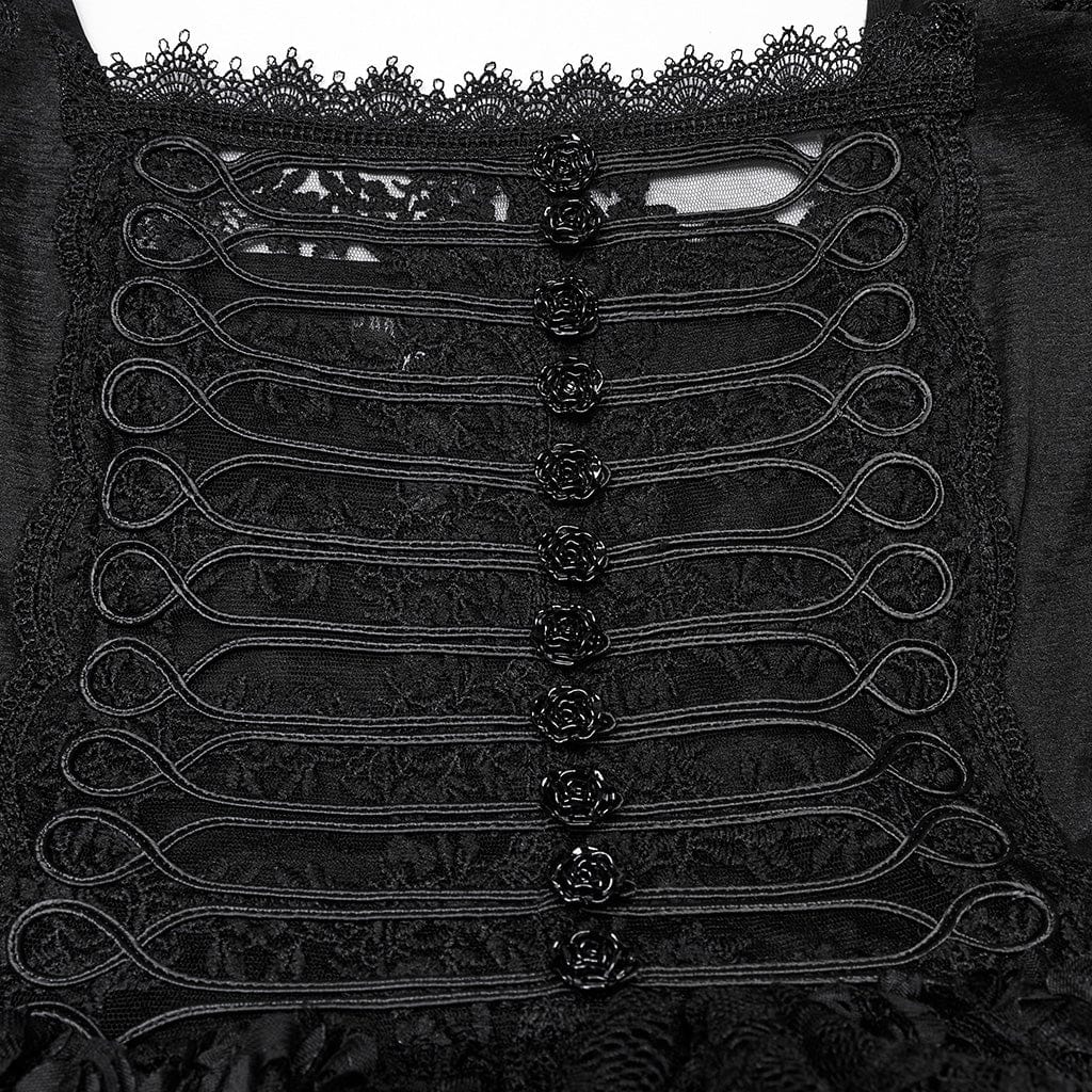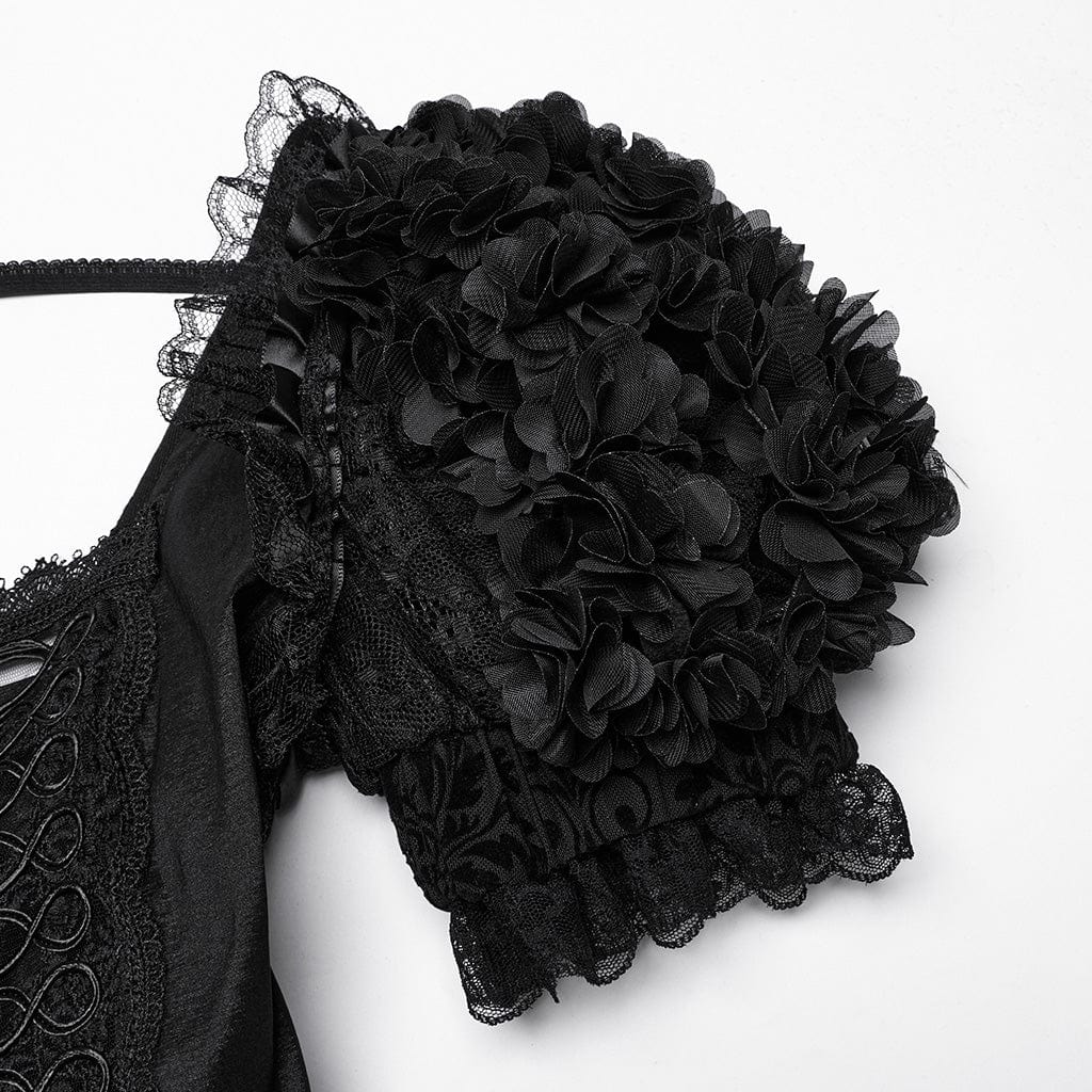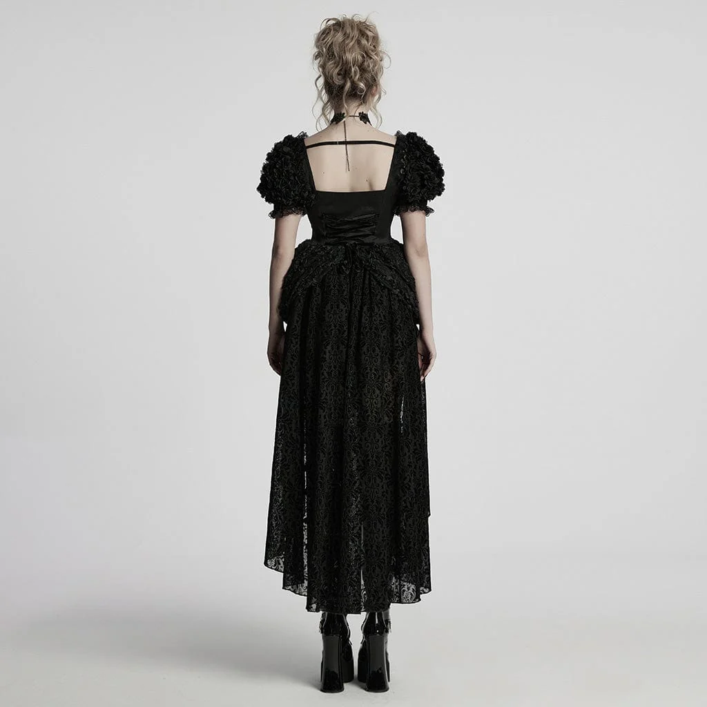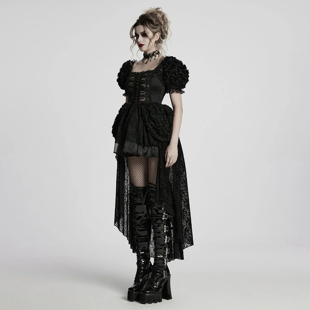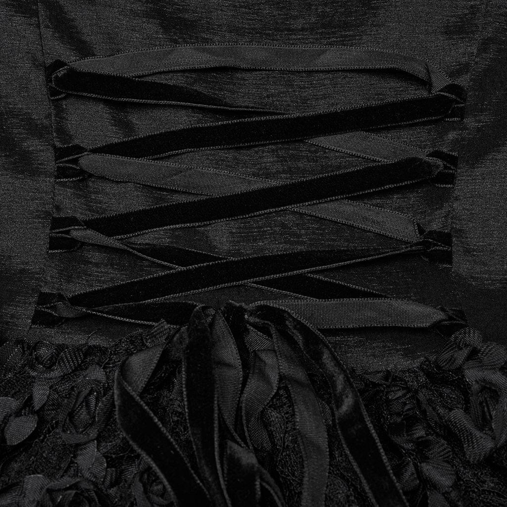 Le maniche a sbuffo, impreziosite da delicati dettagli floreali texturizzati, conferiscono un’estetica regale ed elegante, che ricorda la moda gotica vittoriana. L’allacciatura posteriore e anteriore in stile corsetto consente una vestibilità personalizzabile, aggiungendo struttura e un tocco storico in stile gothic lolita. Strati fluidi di pizzo e rete cadono a cascata, creando un movimento sognante ed etereo a ogni passo.