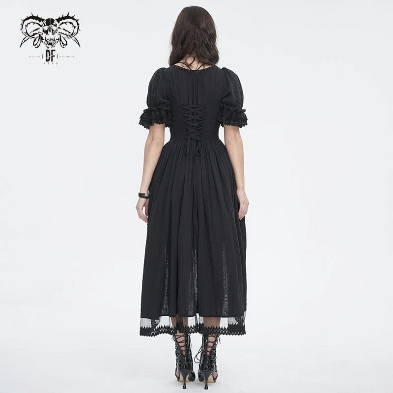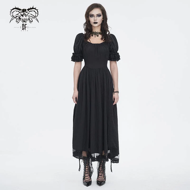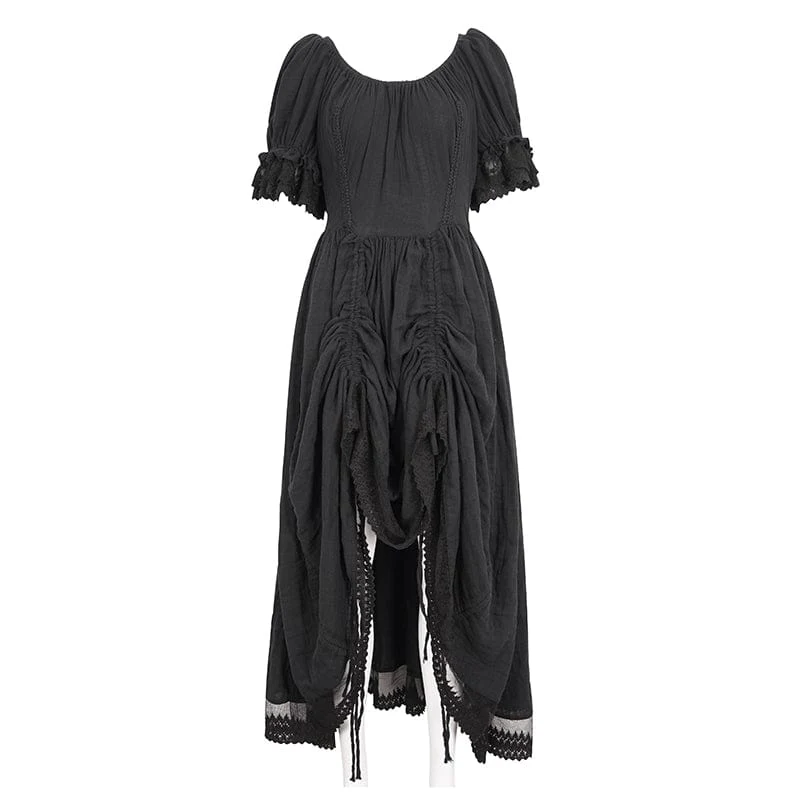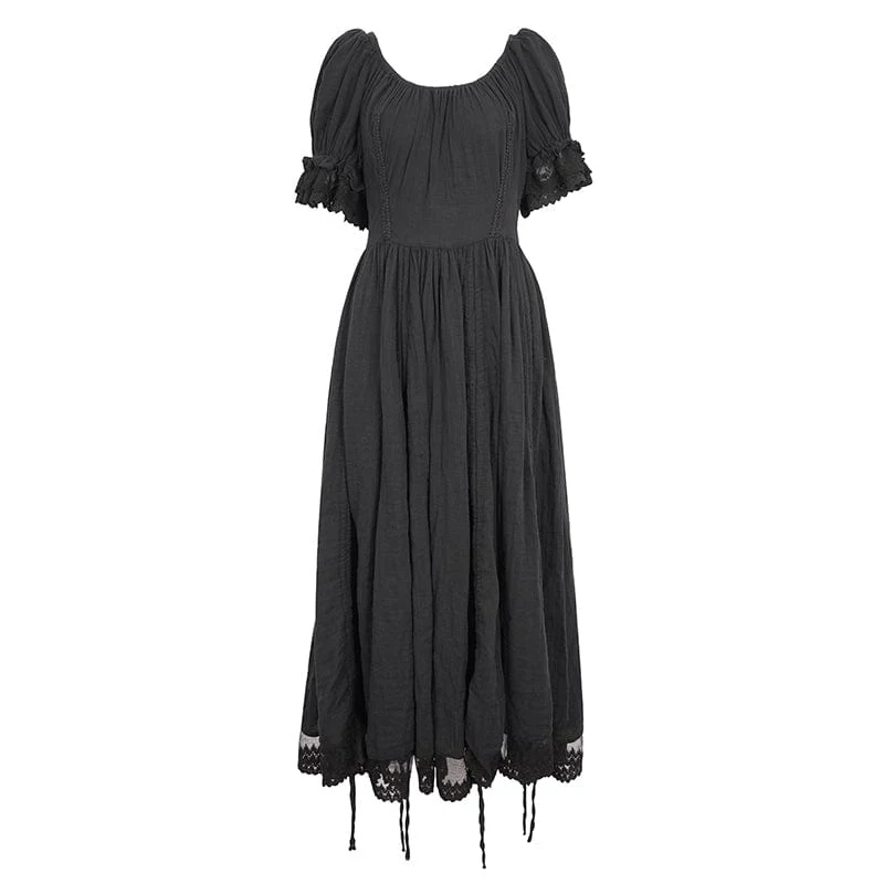 Al suo fascino gotico si aggiunge l’intricato patchwork di pizzo sull’orlo, che aggiunge un tocco delicato ed etereo all’abito. Il contrasto tra il morbido tessuto di cotone e gli intricati dettagli in pizzo crea un fascino visivo accattivante, esaltando il fascino generale del design.