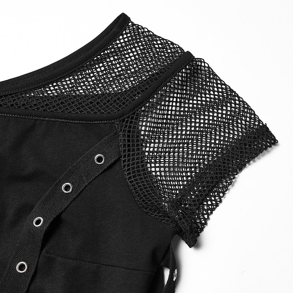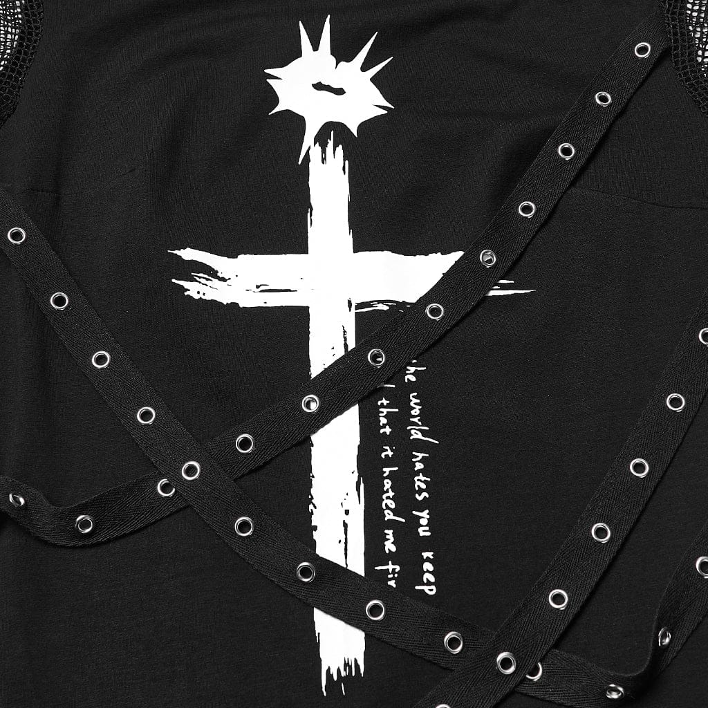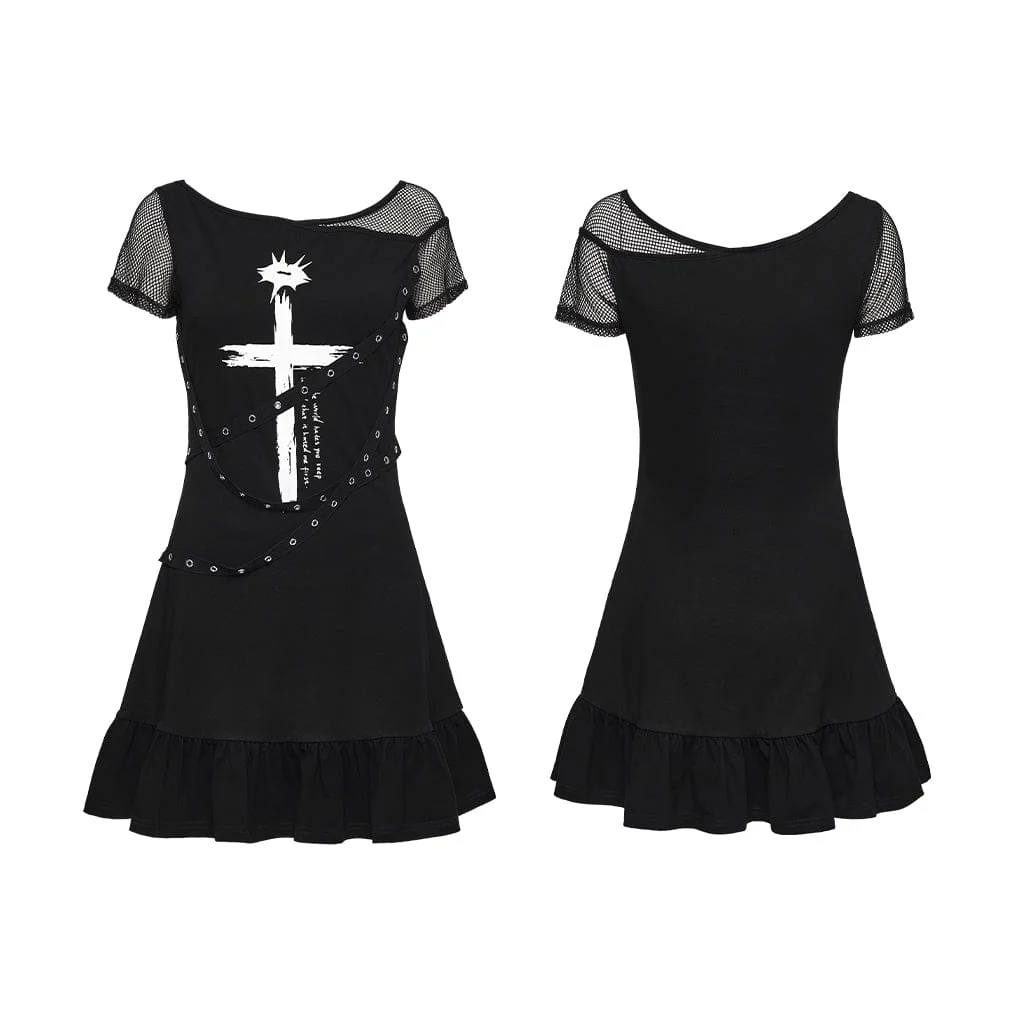 Questo abito da donna a maniche corte con stampa punk a forma di croce e spalline con occhielli è un capo essenziale per qualsiasi guardaroba punk o alternativo, che unisce una silhouette aderente a dettagli audaci per un’audace atmosfera gotica grunge. Le maniche corte in rete, il design asimmetrico delle spalline con occhielli e la grafica a croce bianca conferiscono un’audace personalità punk rock, mentre l’orlo arricciato aggiunge un sottile tocco retrò grunge.