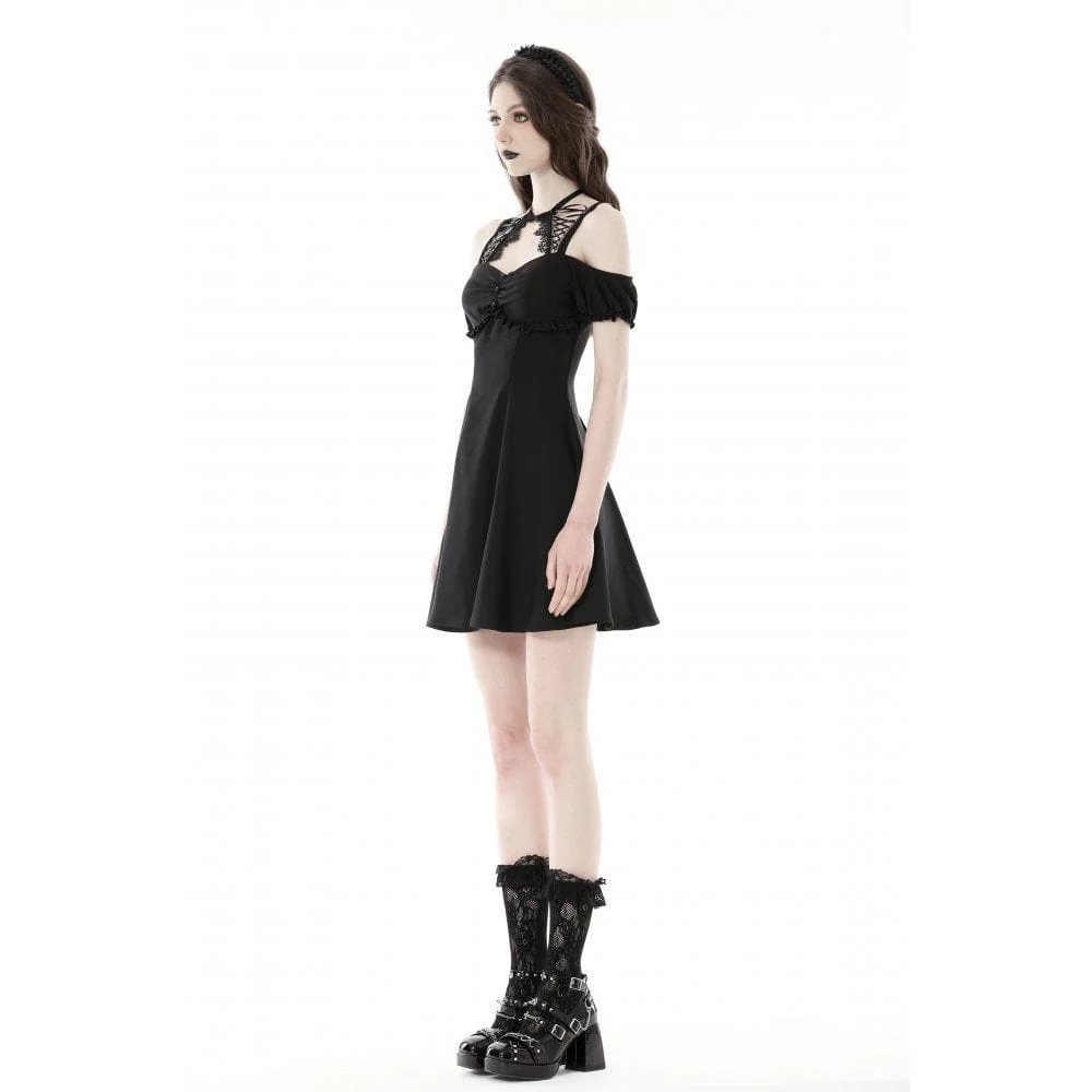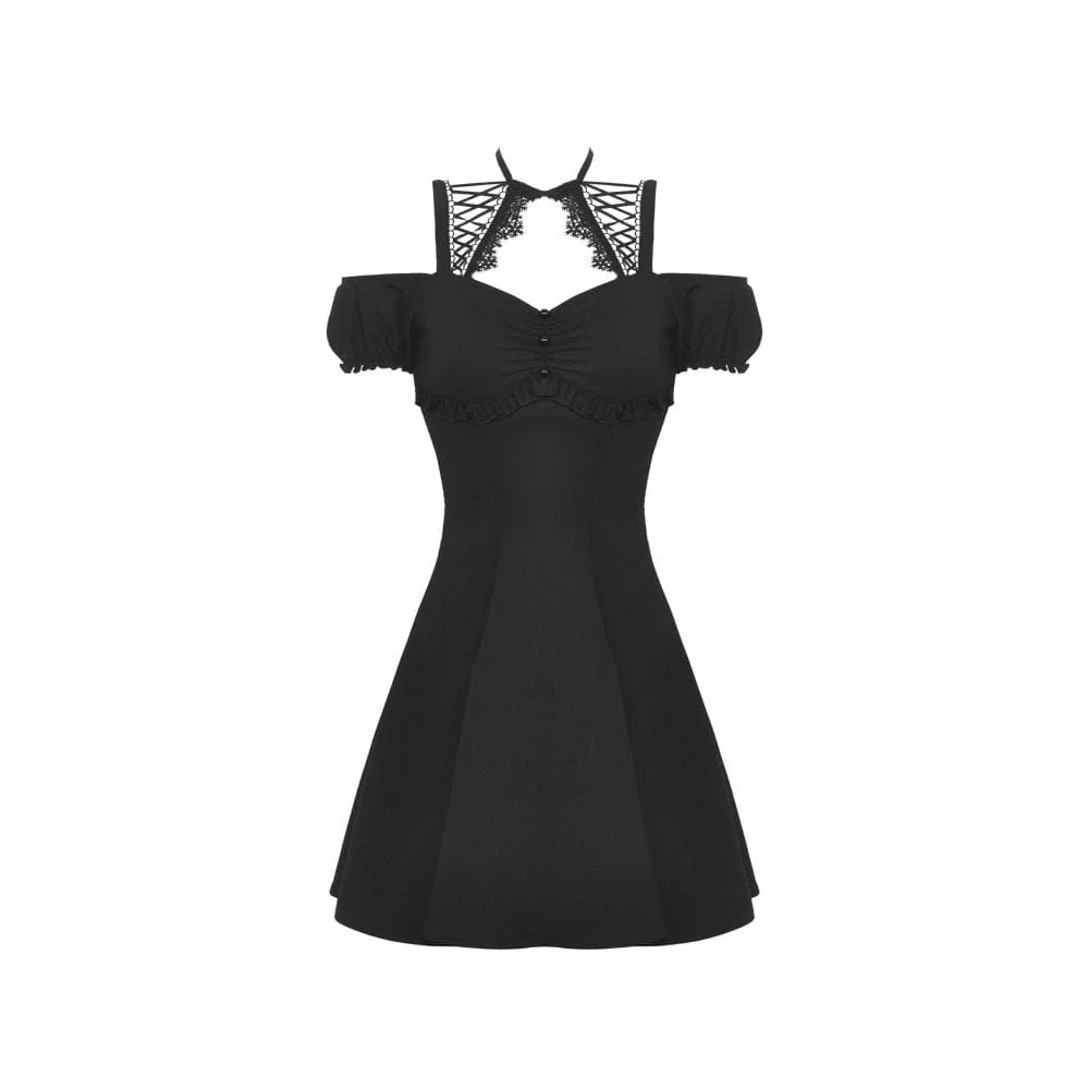 Questo abito corto gotico è senza spalle con maniche corte a sbuffo e scollo in pizzo con spalline. Patchwork arricciato e perline tonde sul davanti. Allacciatura sul retro per la regolazione. Silhouette aderente e tessuto leggermente elasticizzato.