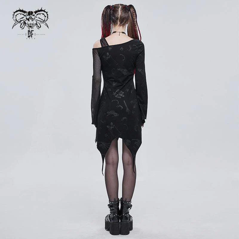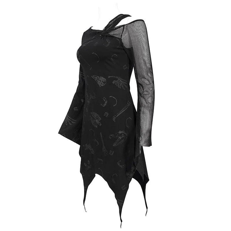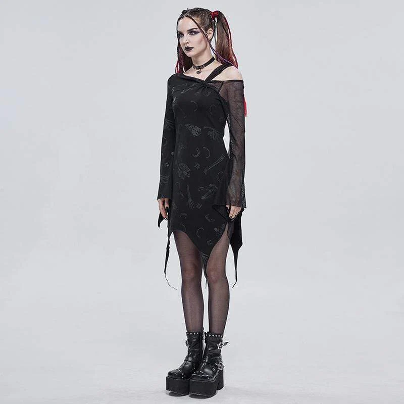 Se stai cercando qualcosa di stravagante, ma mantieni comunque l’atmosfera gotica sul punto, allora, questo è l’abito che puoi indossare nelle tue occasioni formali ed essere ancora te stesso. La parte superiore del vestito inizia con una linea morbida, creando uno squilibrio tra il lato sinistro e il lato destro. Una spalla è coperta mentre l’altra è nuda. Si collega a maniche lunghe, rendendo il braccio sottile e sexy. La rete è presente in tutto l’abito, rendendolo morbido e femminile. I motivi discreti creano un look straordinario. Per aggiungere un po’ di ribelle, l’abito finisce in modo inaspettato, sembra strappato e tirato di lato, ma in chiave moderna.