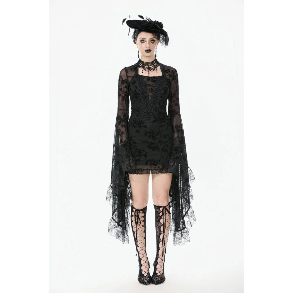 Abbraccia il romanticismo gotico della rete effetto velluto. Questo abito aderente è realizzato in tessuto elasticizzato che avvolge comodamente le tue forme, aggiungendo al contempo una texture misteriosa. Le maniche a campana oversize e l’orlo sono rifiniti con delicato pizzo, completato da dettagli in pizzo elastico sulla scollatura. La parte anteriore presenta un elaborato ricamo floreale e la schiena con lacci consente una modellatura regolabile e un ulteriore intrigo visivo. Che sia abbinato a un’estetica Lolita, a un look street gotico o a una performance teatrale, questo abito conferisce un fascino dark e aggraziato a qualsiasi scena.