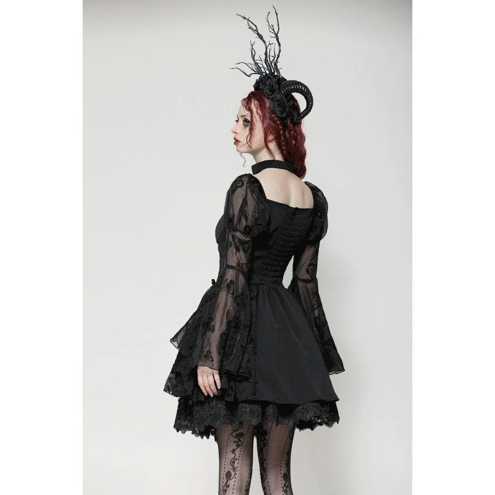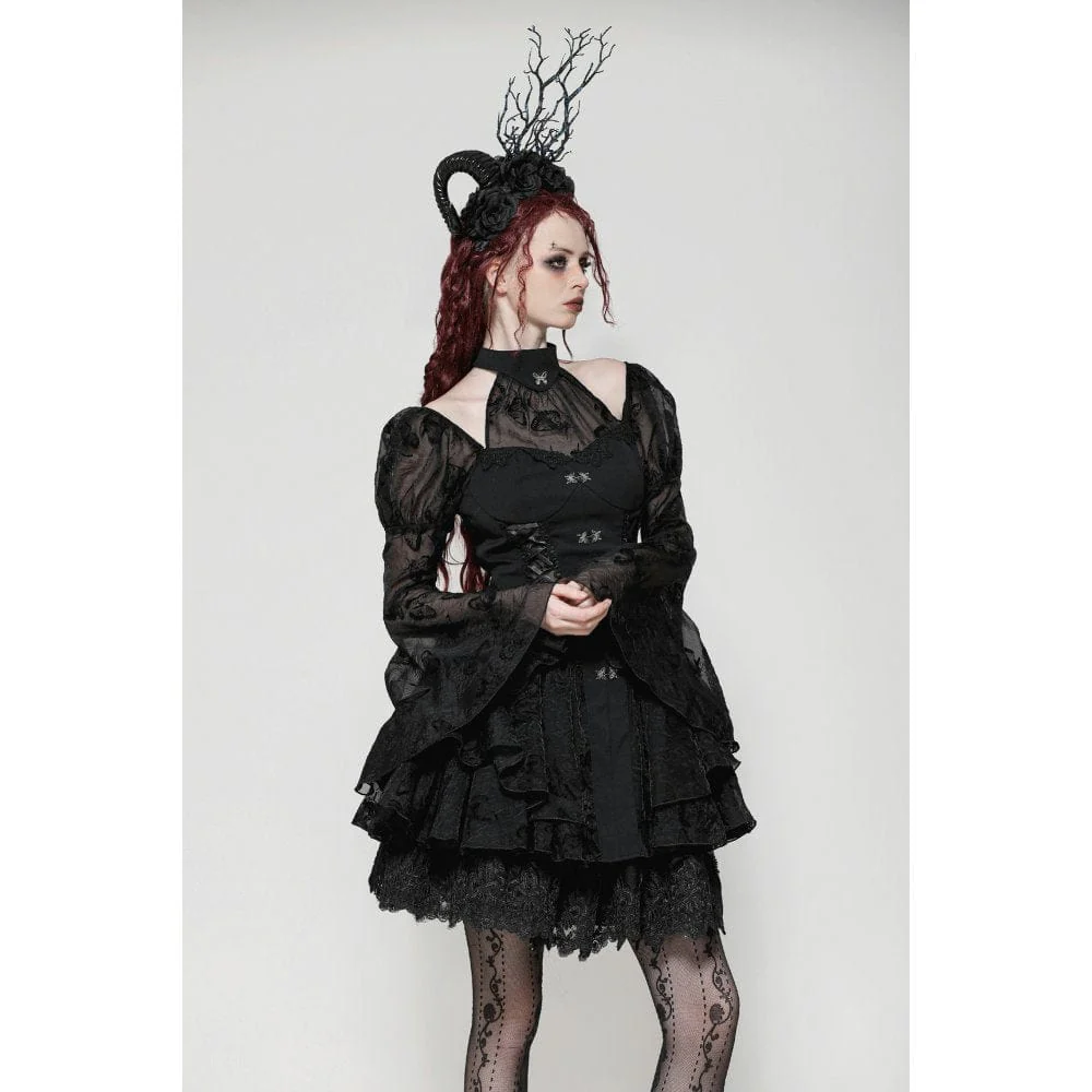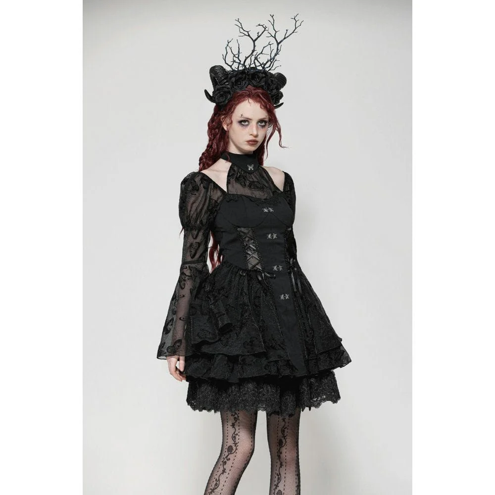L’abito vanta un intricato pizzo a farfalla che si fonde perfettamente con il tessuto nero, estendendosi fino all’orlo, creando un accattivante contrasto e aggiungendo un tocco di fascino etereo. Le maniche a sbuffo con polsini svasati contribuiscono all’ispirazione Lolita dell’abito, mentre i ritagli in rete sui lati e sulla gonna introducono un effetto arioso e stratificato, rendendo l’intero capo leggero e dinamico.