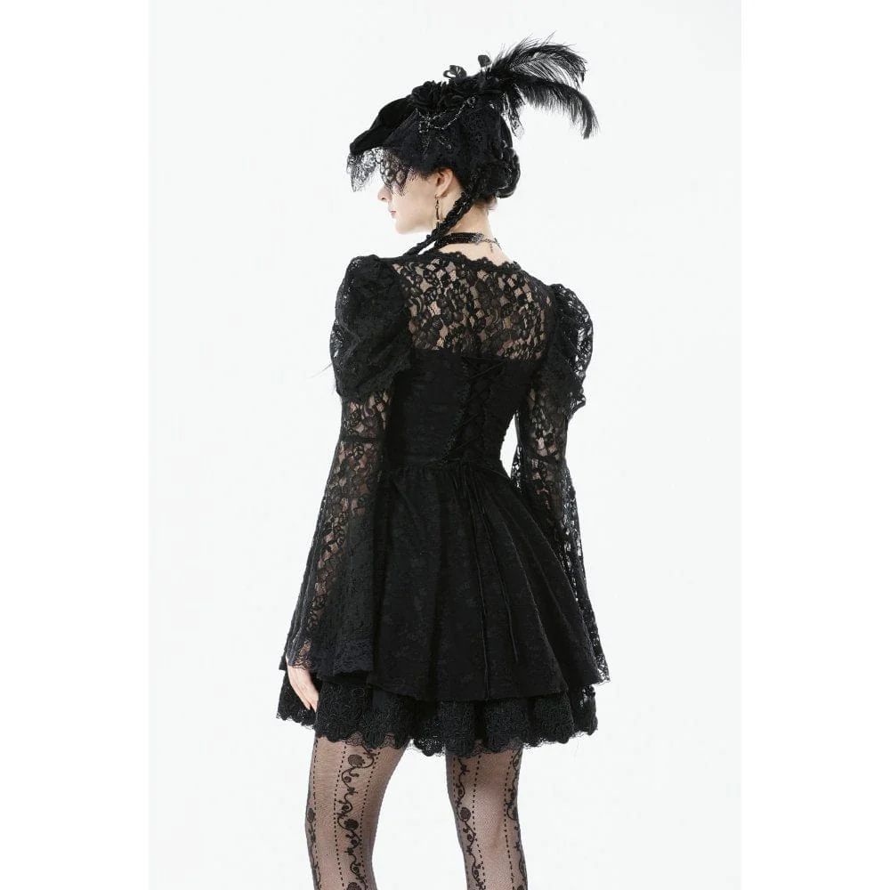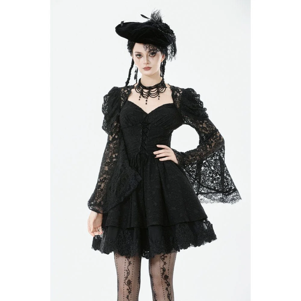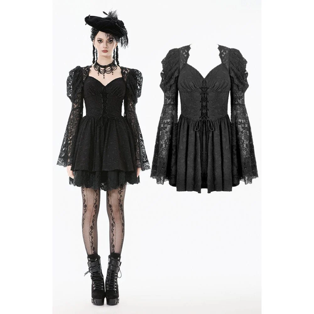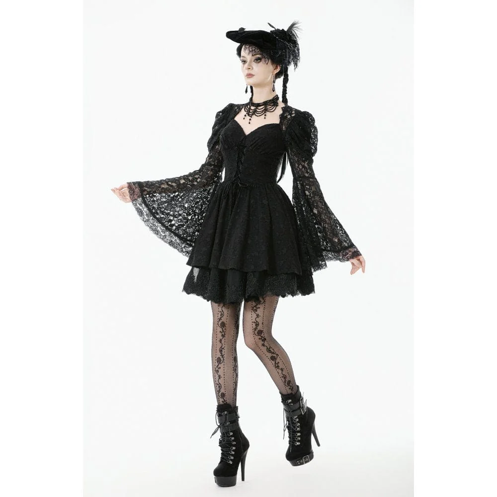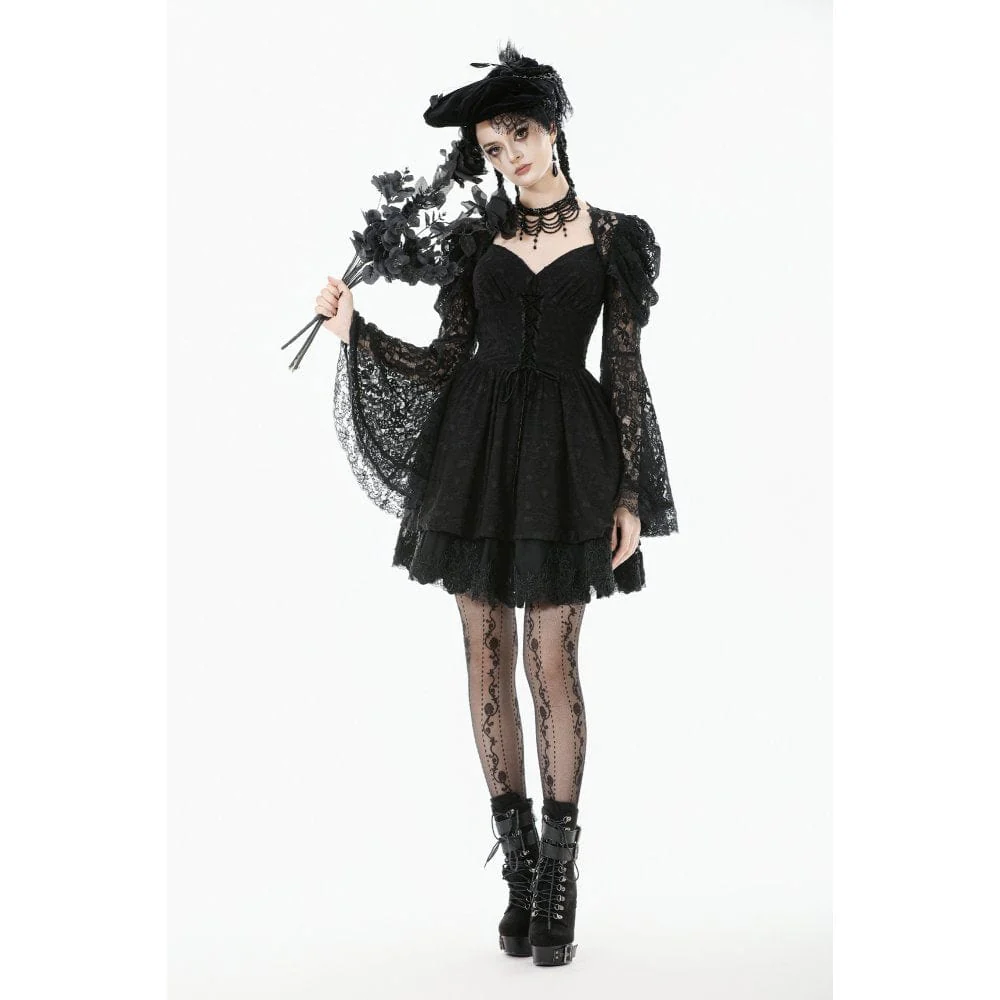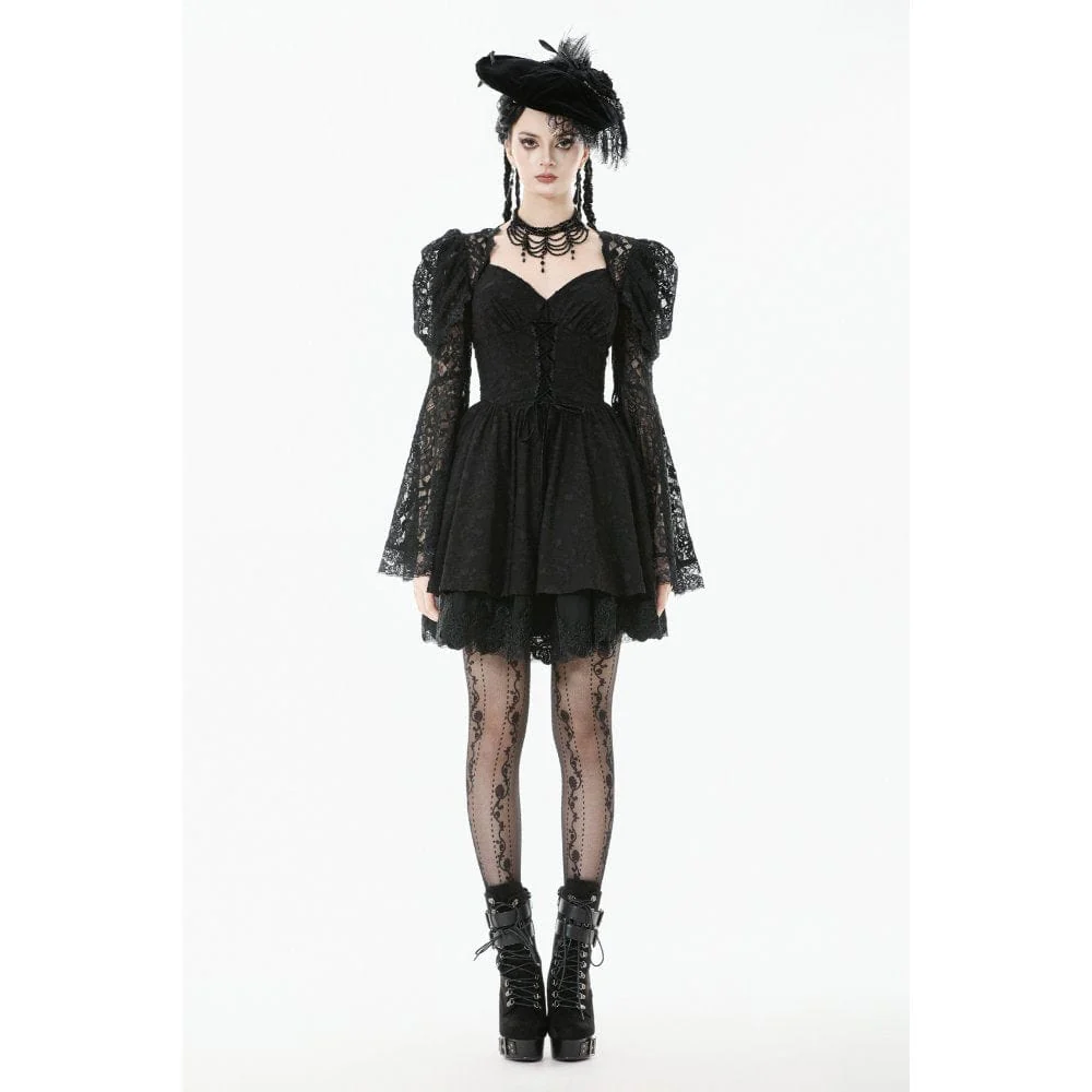 Questo abito in pizzo gotico è realizzato in lussuoso tessuto jacquard, che offre un raffinato look vintage. Il design senza spalline esalta la silhouette, mentre delicati bordi in pizzo impreziosiscono la scollatura, le maniche a sbuffo e i polsini, per un tocco di romantica eleganza. La schiena con lacci consente una vestibilità regolabile, garantendo comfort e una silhouette lusinghiera. Un perfetto mix di fascino gotico e graziosa femminilità.