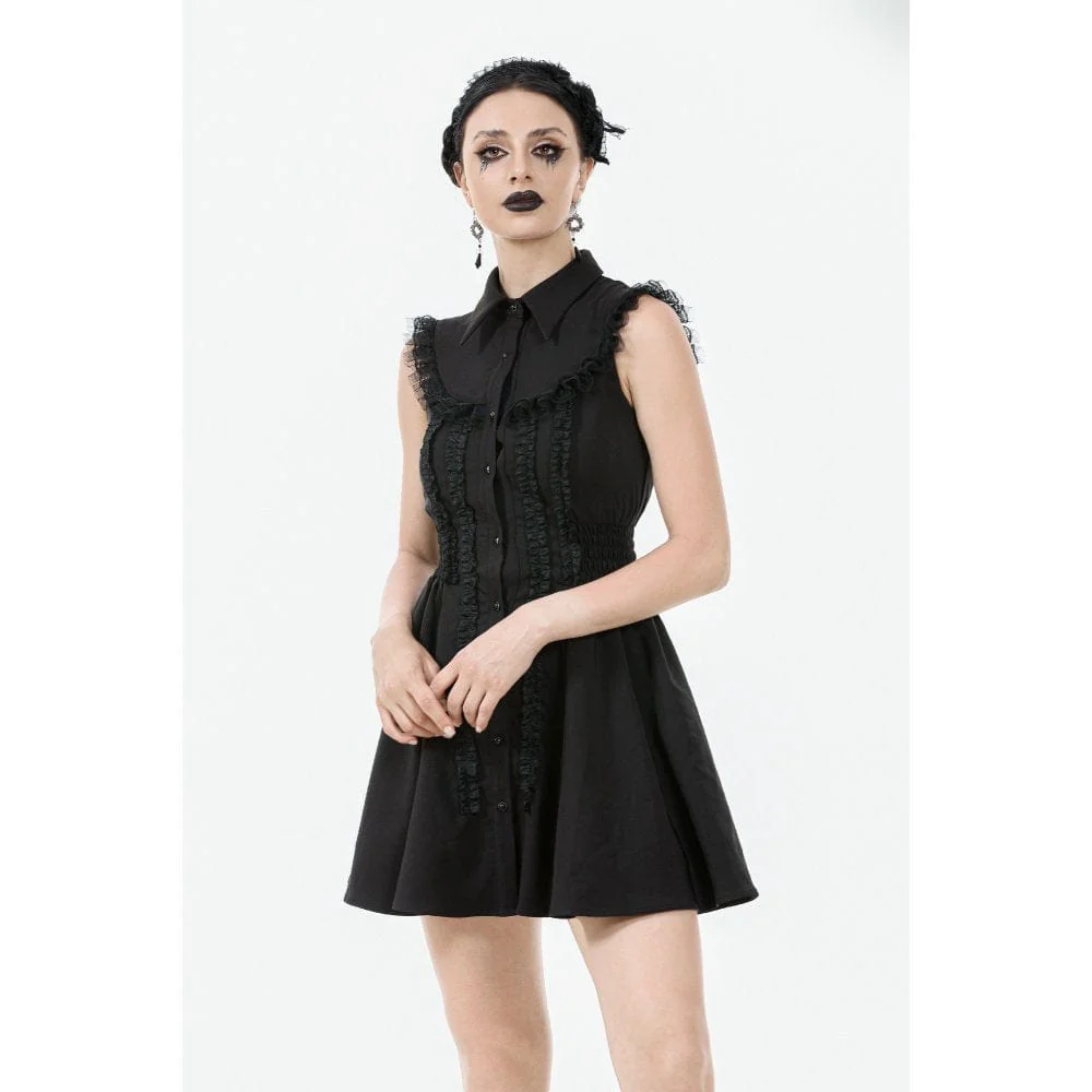 Questo abito senza maniche di ispirazione gotica presenta un colletto rialzato e una patta con bottoni a tutta lunghezza, unendo struttura e fascino. I volant verticali sul corpetto aggiungono una texture intricata, mentre la vita aderente e la gonna svasata esaltano la silhouette con un tocco giocoso e lusinghiero. Progettato pensando sia alla funzionalità che all’estetica, questo abito è ideale per la moda street gotica, le feste alternative o per un look quotidiano con un tocco dark.