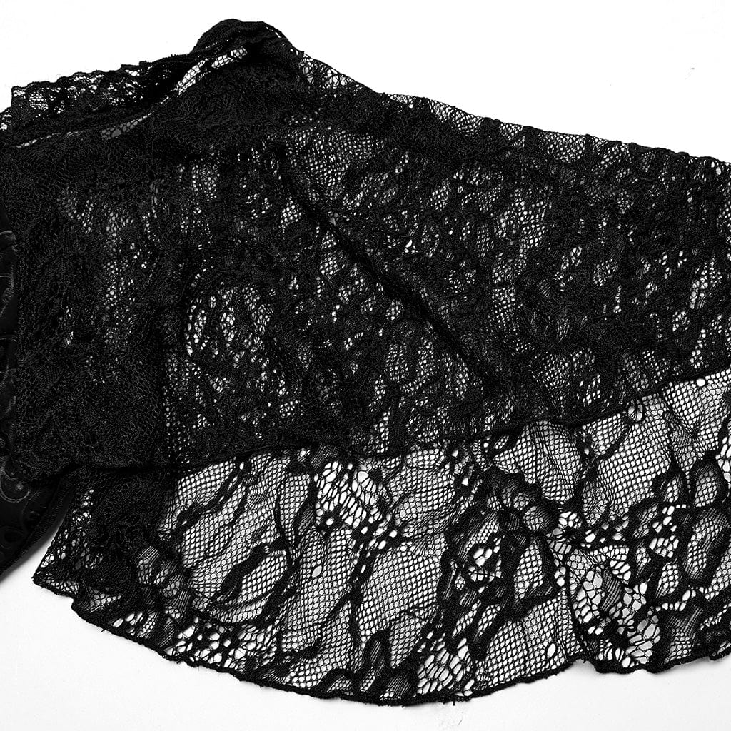 Le maniche in pizzo a strati scendono con grazia, pendendo naturalmente per creare uno straordinario effetto visivo ad ogni movimento. Delicati patchwork di pizzo adornano l’orlo della gonna, esaltando il romanticismo gotico del vestito.