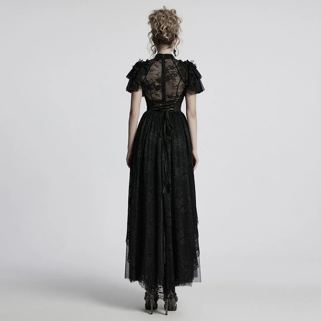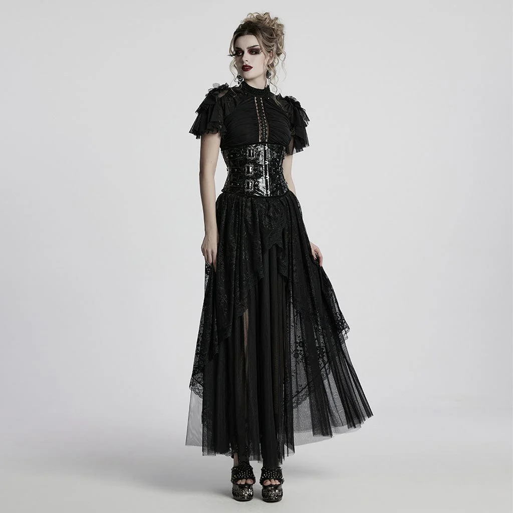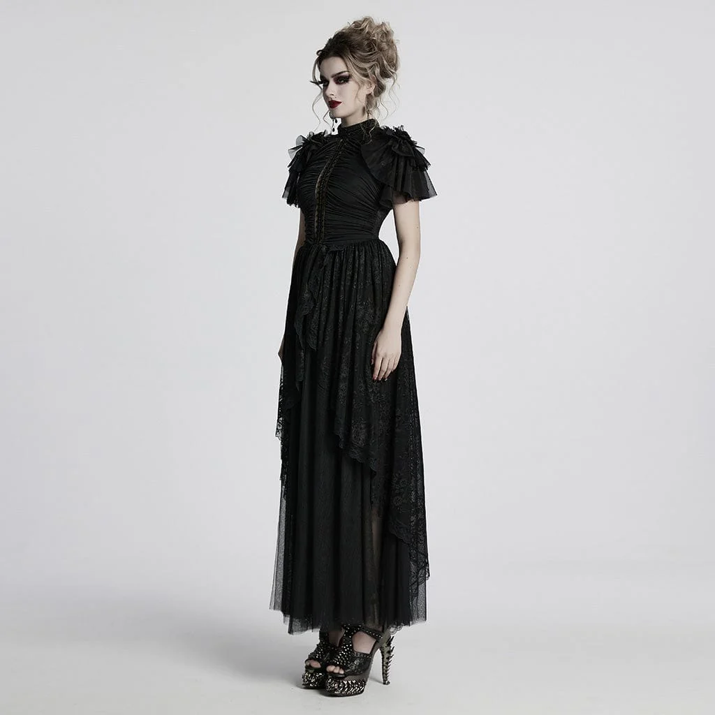 Immergiti in un mondo di eleganza gotica con l’abito da ballo a strati con volant in pizzo gotico da donna. Questo splendido abito combina pizzo elastico e tessuto a rete, creando una silhouette eterea ma al tempo stesso spettacolare. Gli squisiti ricami di perline sul colletto e sul davanti aggiungono un tocco di lusso e romanticismo, impreziosindo il design con intricati dettagli gotici. Le maniche a balze e la gonna a strati in rete offrono eleganza e movimento, rendendo questo abito ideale per chi cerca una sofisticatezza dark.