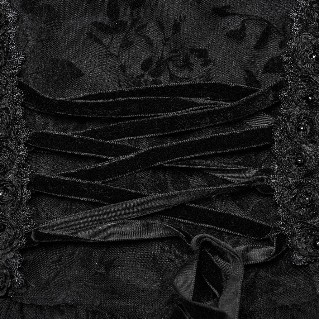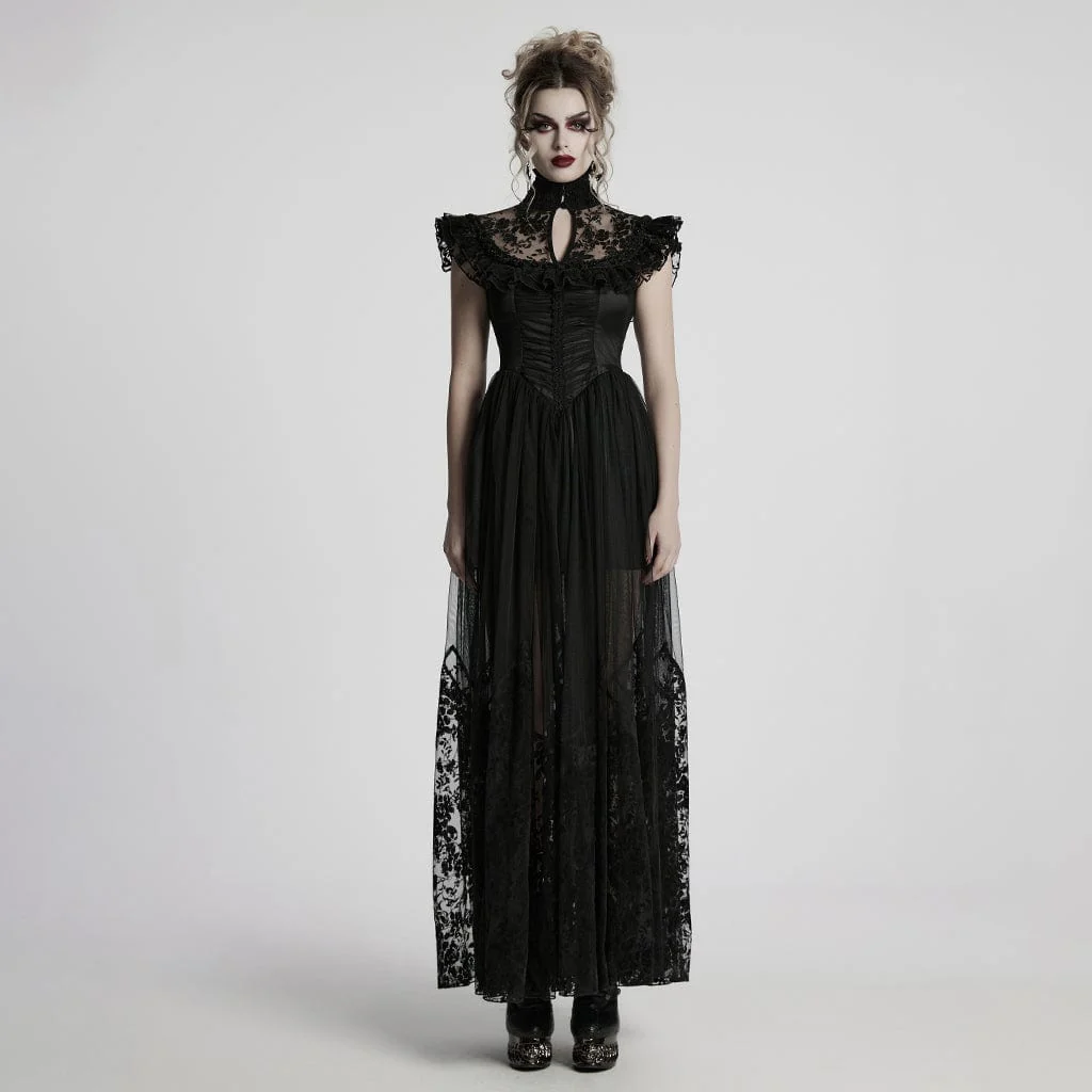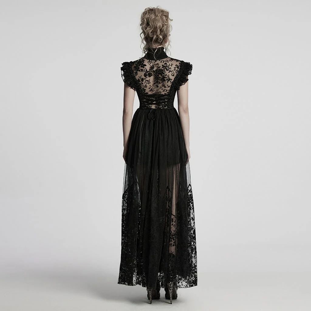 Trasmetti un’eleganza dark con l’abito formale da donna in rete floccata con colletto alto in stile gotico. Realizzato in una combinazione di rete floccata e raso, questo abito offre un perfetto equilibrio tra texture e raffinatezza. La delicata floccatura floreale sul tessuto a rete crea un aspetto etereo e romantico, mentre il corpetto in raso aggiunge un contrasto lussuoso e morbido. Il colletto alto conferisce un tocco regale di ispirazione vittoriana, ideale per chi apprezza l’eleganza gotica e il fascino vintage.