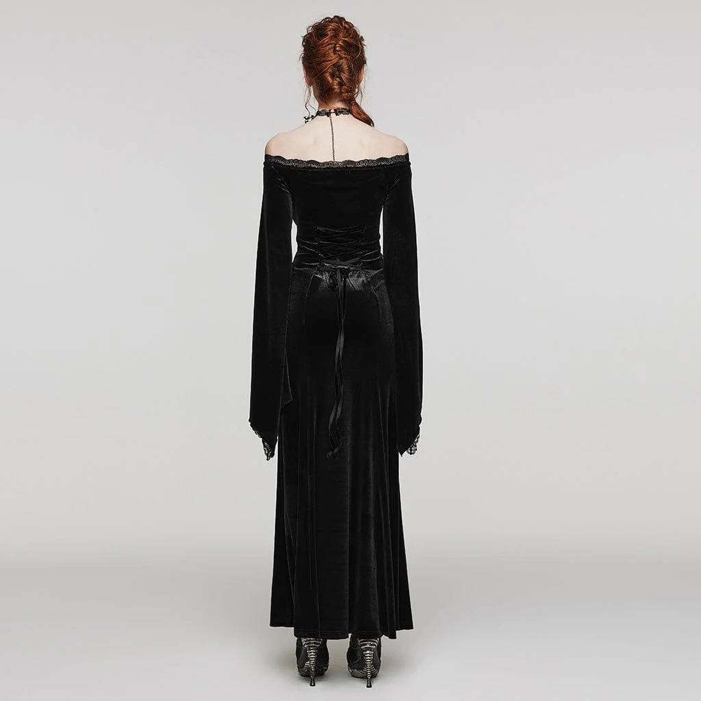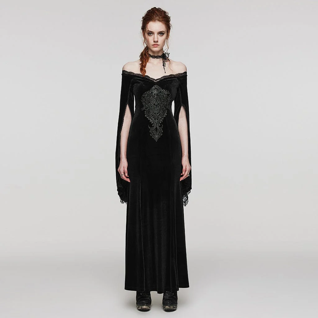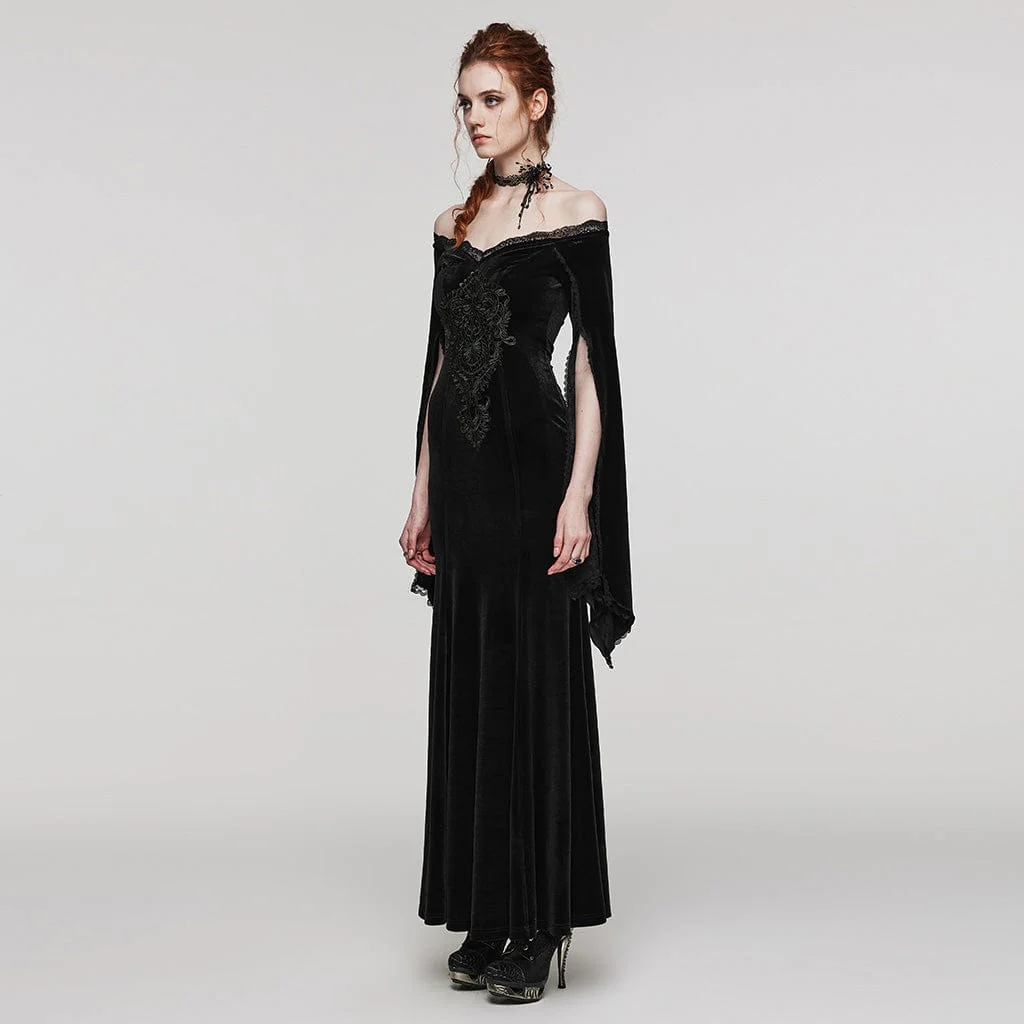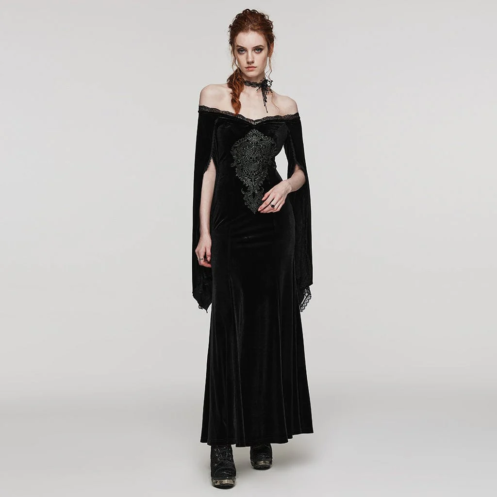 Questo abito gotico è realizzato in tessuto di velluto. Design con spalle scoperte e orlo in pizzo. Ricami floreali sul davanti. Patchwork di maniche a punta spaccate con pizzo. Buon tessuto elastico.