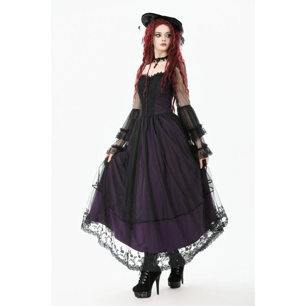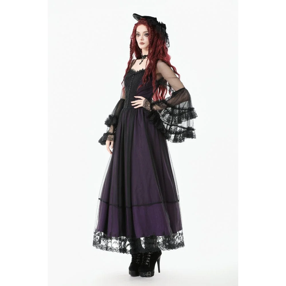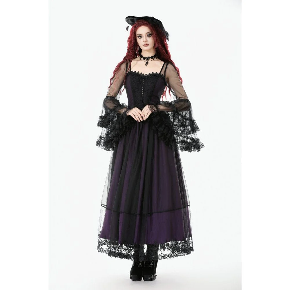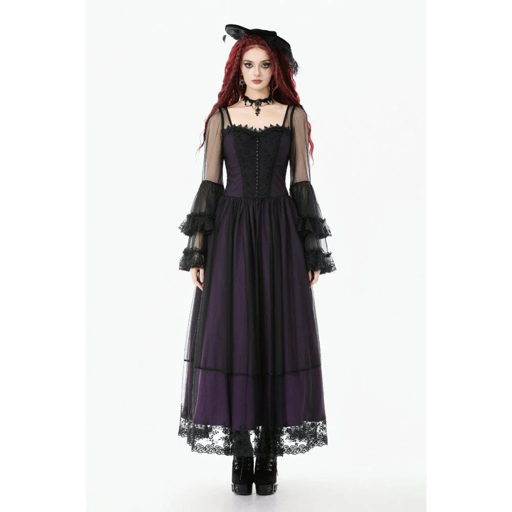 Immergiti in un ballo in maschera di mezzanotte con questo abito lungo viola in stile palazzo gotico, che fonde eleganza pura con un tocco di fascino oscuro. Realizzato in rete traslucida sovrapposta a una ricca fodera viola, la silhouette sussurra mistero a ogni movimento.