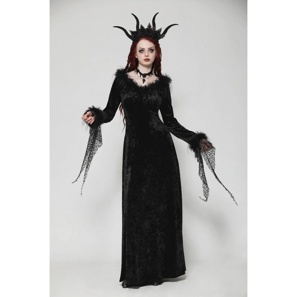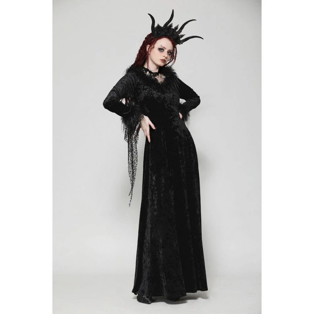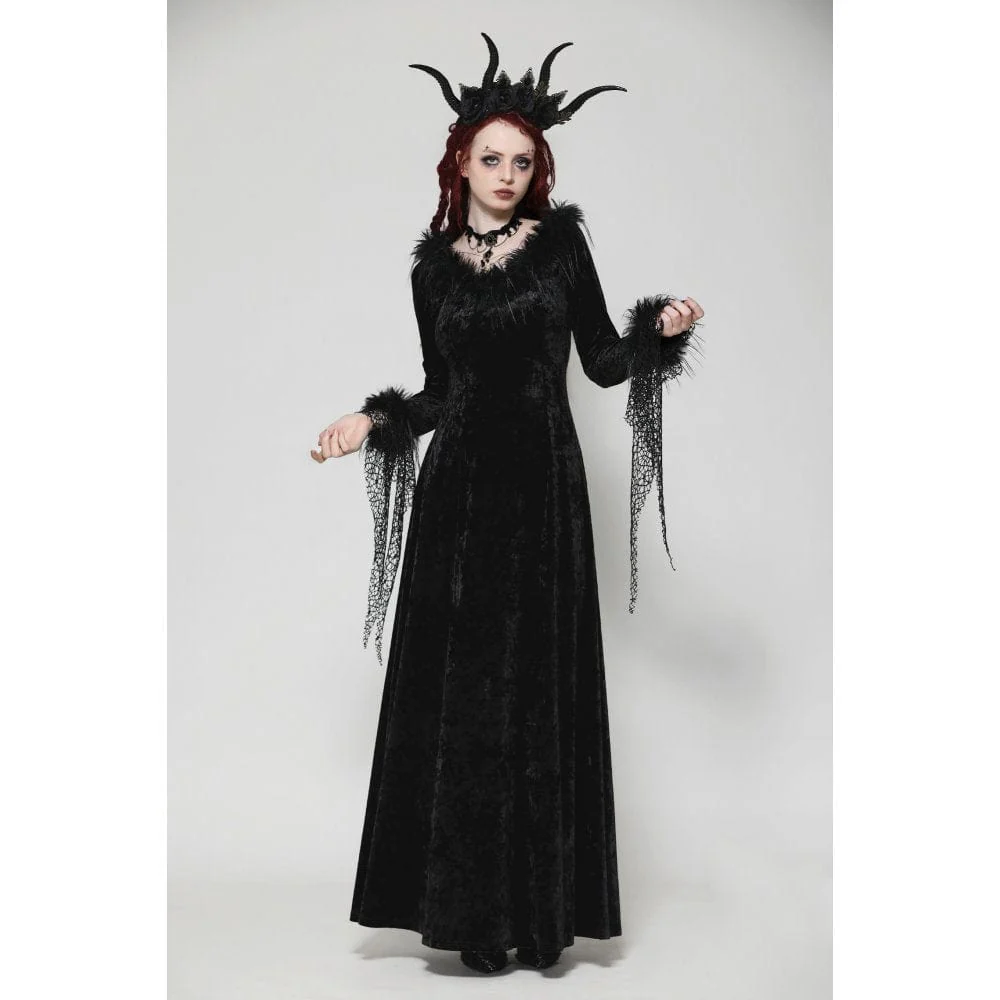 Questo lungo abito gotico, realizzato in lussuoso velluto, emana un’aura di eleganza oscura. La profonda scollatura a V è accentuata da finiture in pelliccia, aggiungendo un tocco di nobiltà e fascino. Il design irregolare a rete sui polsini introduce un pizzico di ribellione, rompendo l’equilibrio convenzionale. Il taglio minimalista enfatizza eleganza e raffinatezza, rendendo questo abito un capo raffinato intriso di fascino gotico.