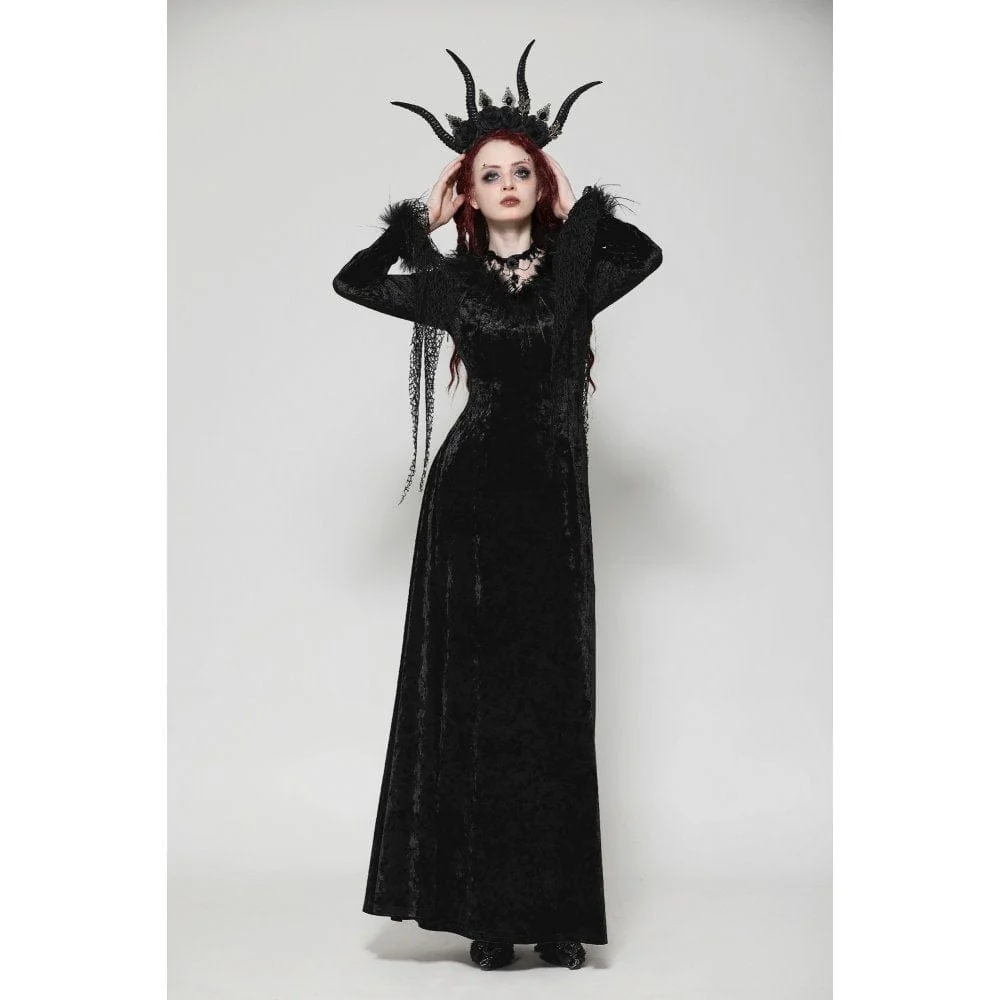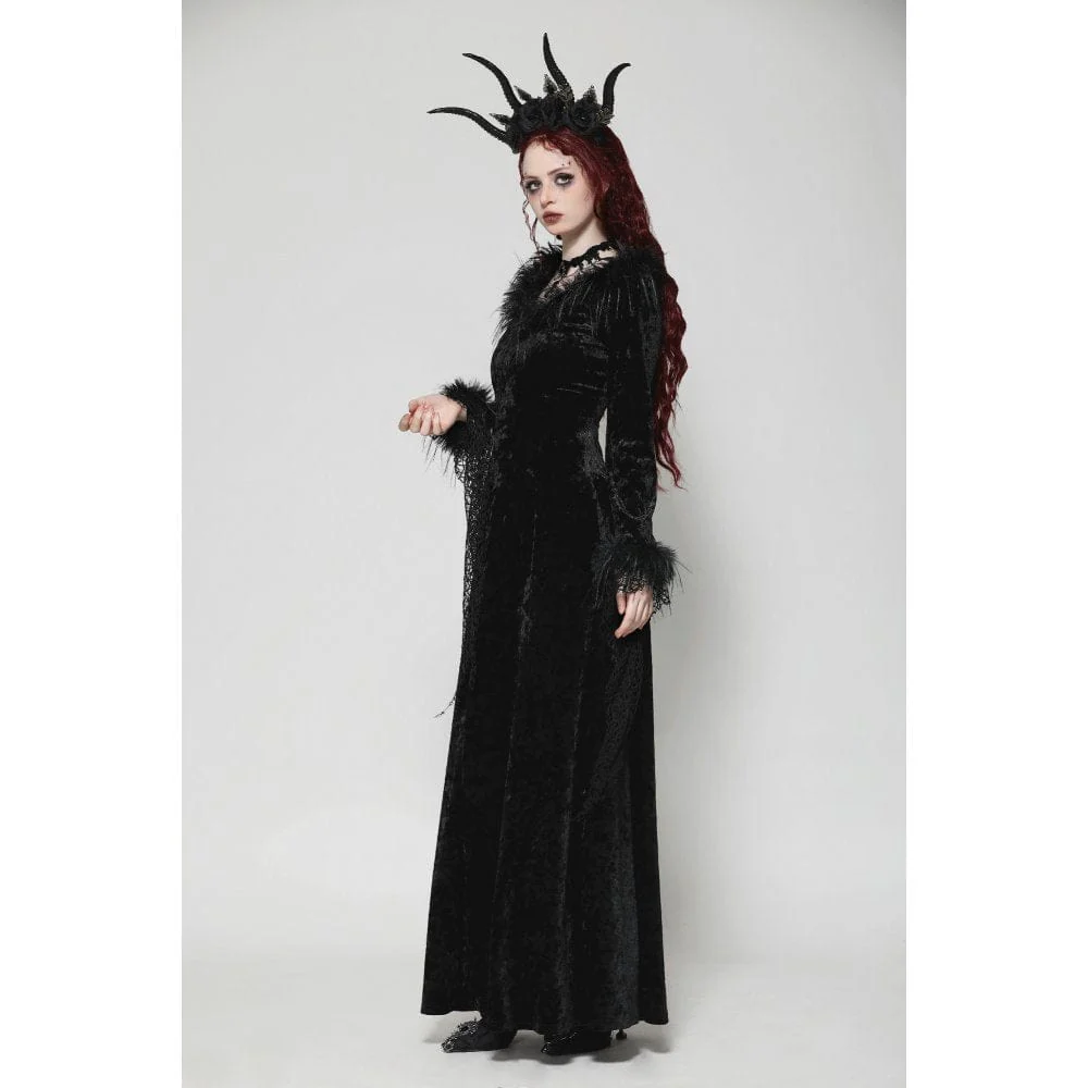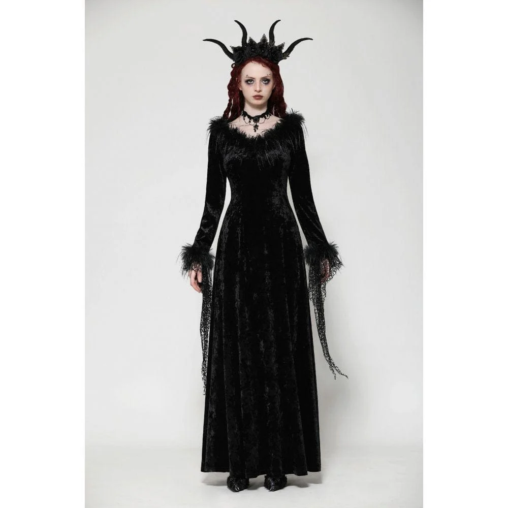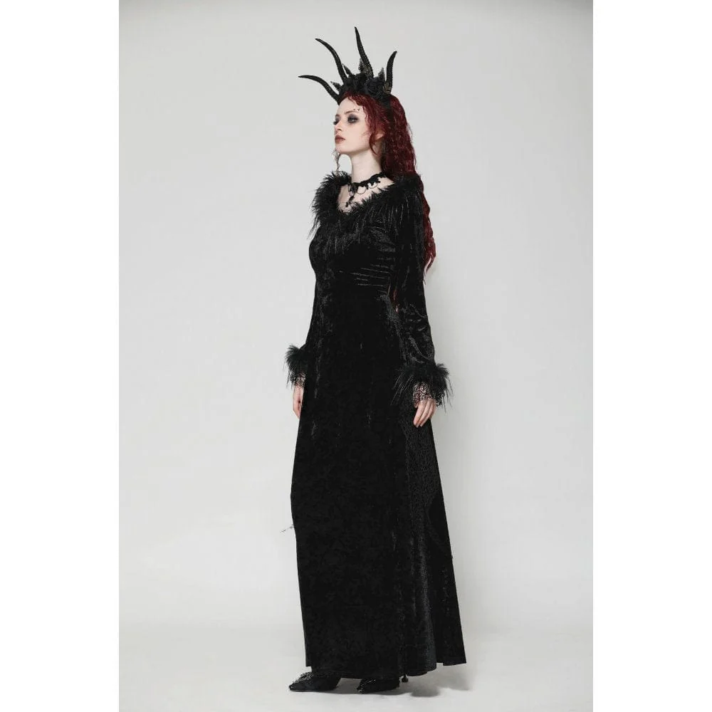 Questo lungo abito gotico, realizzato in lussuoso velluto, emana un’aura di eleganza oscura. La profonda scollatura a V è accentuata da finiture in pelliccia, aggiungendo un tocco di nobiltà e fascino. Il design irregolare a rete sui polsini introduce un pizzico di ribellione, rompendo l’equilibrio convenzionale. Il taglio minimalista enfatizza eleganza e raffinatezza, rendendo questo abito un capo raffinato intriso di fascino gotico.