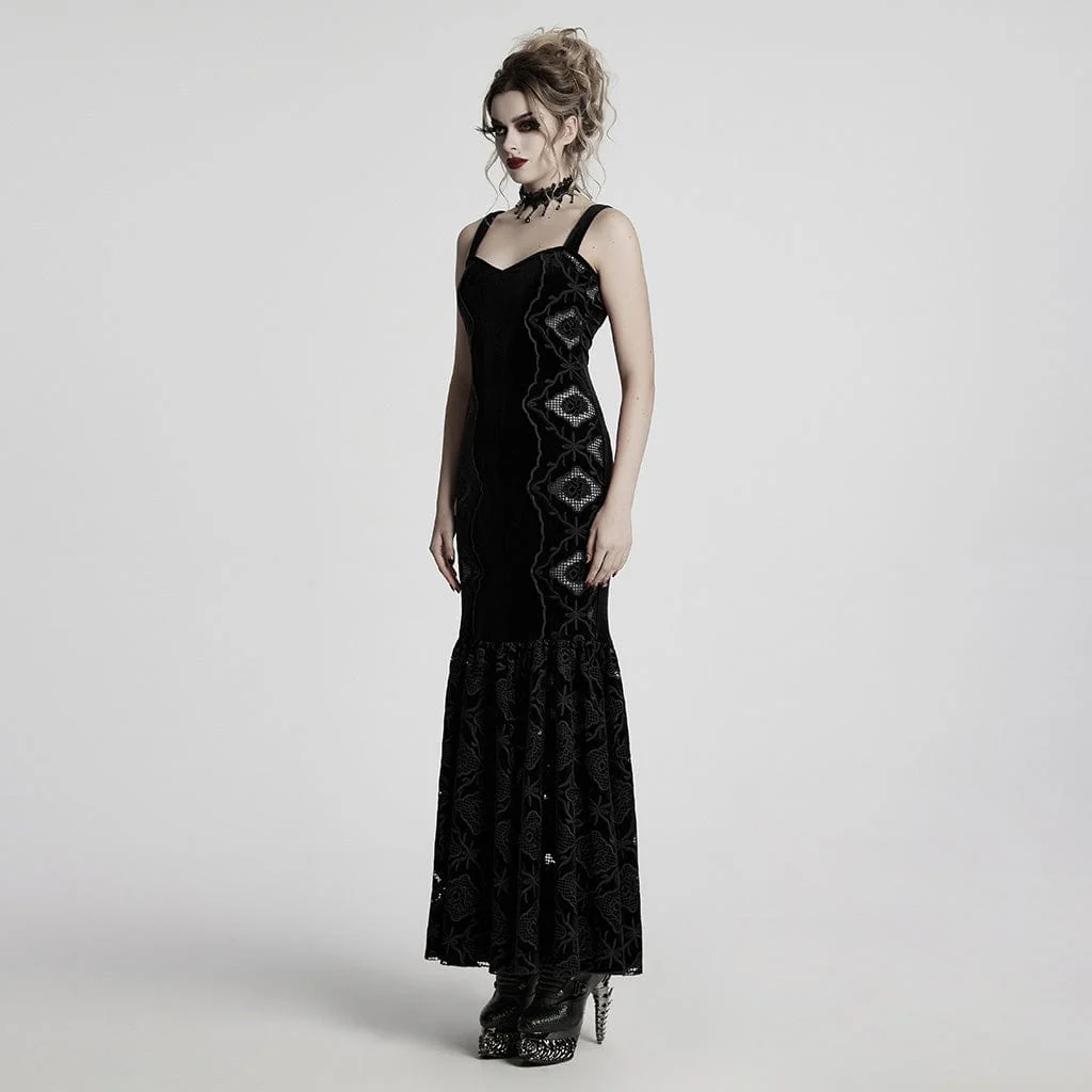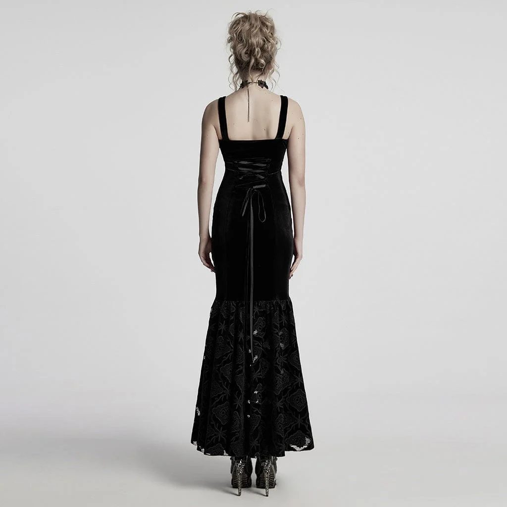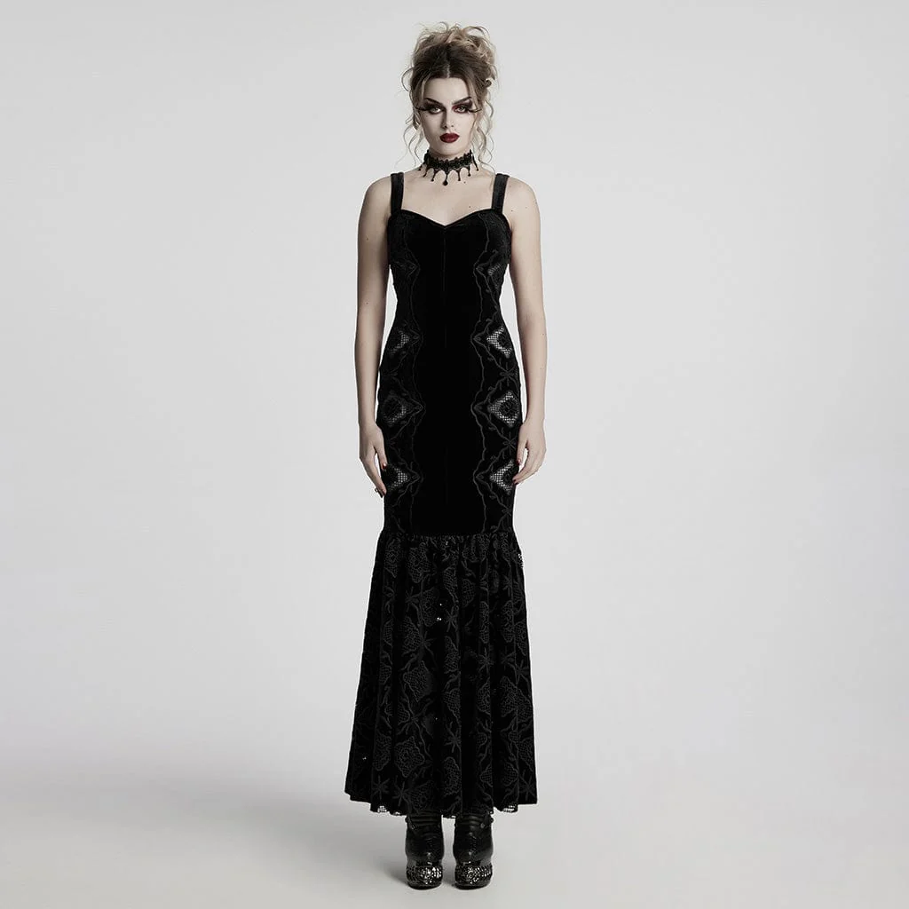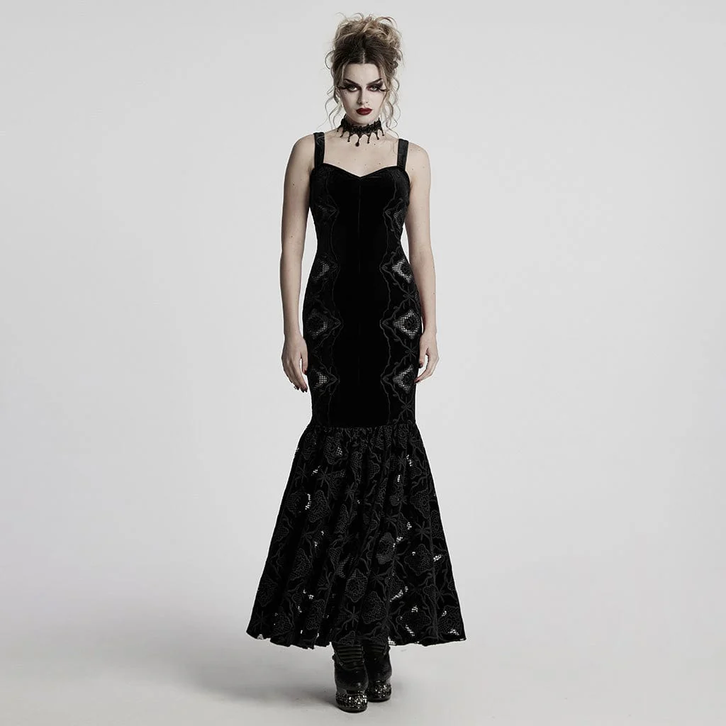 Abito da sposa nero con sottoveste a sirena in velluto ricamato floreale gotico da donna