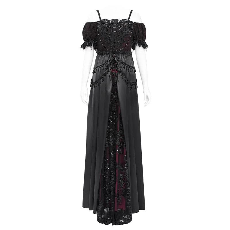 Il corpetto allacciato in stile corsetto stringe la vita per una silhouette attillata, evidenziando le tue curve e aggiungendo un tocco di raffinatezza di ispirazione vittoriana. Le maniche a sbuffo, realizzate con pizzo intricato e dettagli arricciati, esaltano il fascino da fiaba oscura dell’abito. La gonna a strati scorre in modo spettacolare, con una sovrapposizione di chiffon che cade a cascata su un pannello di pizzo ricamato, creando un sorprendente insieme di eterei elementi gotici vittoriani.
