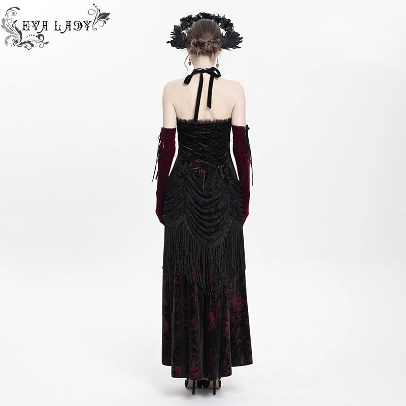 Abito lungo da sposa da donna in stile gotico floreale con lacci e arricciature, rosso