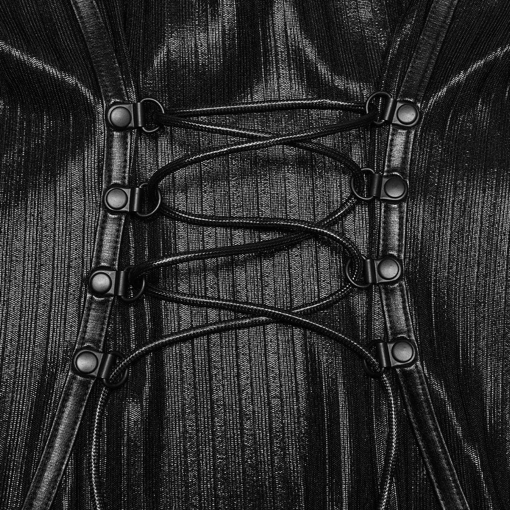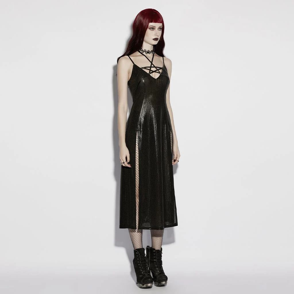 Questo abito sottoveste punk rock è il capo essenziale per ogni guardaroba alternativo, perfetto per i festival, con scollatura a pentacolo con lacci, spacchi laterali e una trama a coste che cattura la luce a ogni movimento. La sua silhouette aderente ti fa sentire sicura di te mentre balli tutto il giorno.