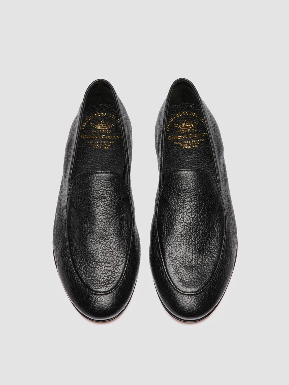 Realizzati a mano in Italia, i mocassini Airto 018 presentano una silhouette morbida e sfoderata in pregiata pelle nera. Il design minimalista senza lacci è abbinato a un’elegante suola in cuoio e a un sottile tacco a blocco.