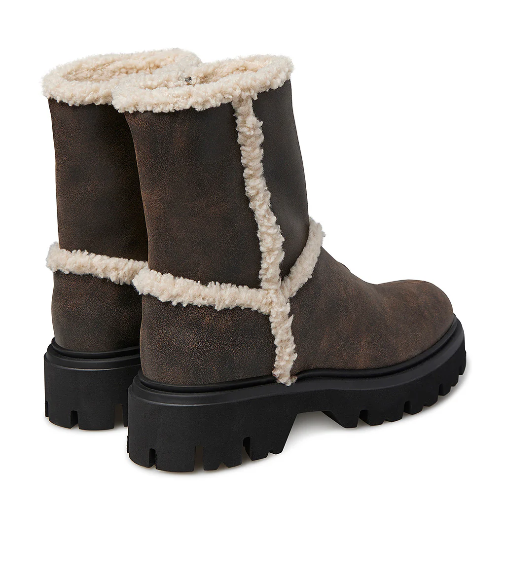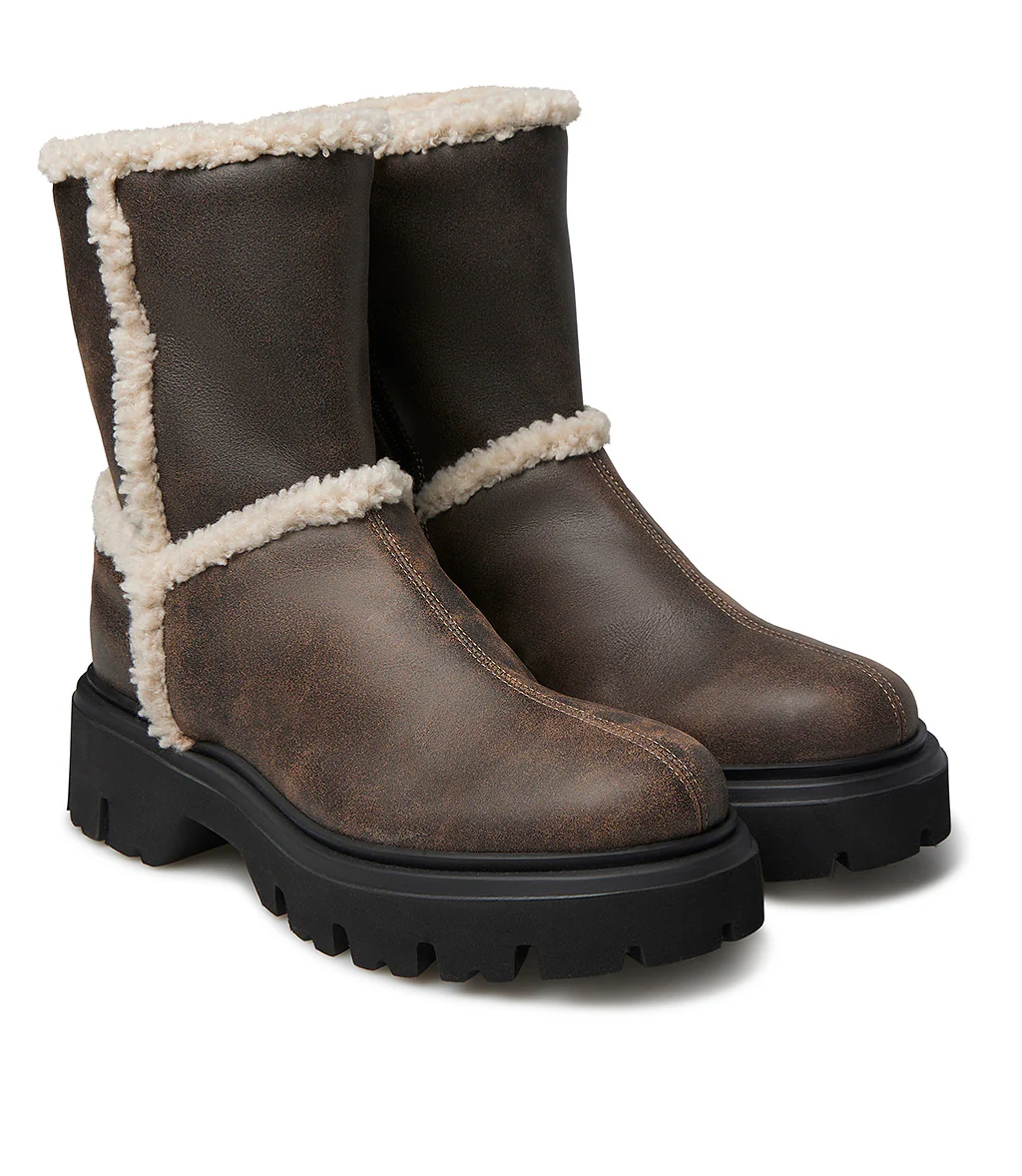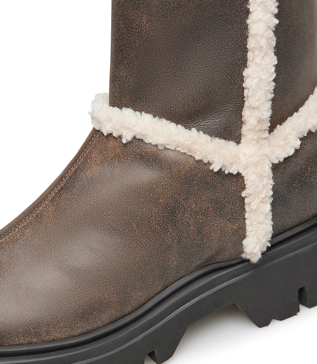 Anfibi in pelle color tabacco con finiture e fodera interna in tessuto effetto montone. Elevati da una suola platform chunky in suola carrarmato in gomma assicurano in massimo comfort. il must-have per la stagione invernale