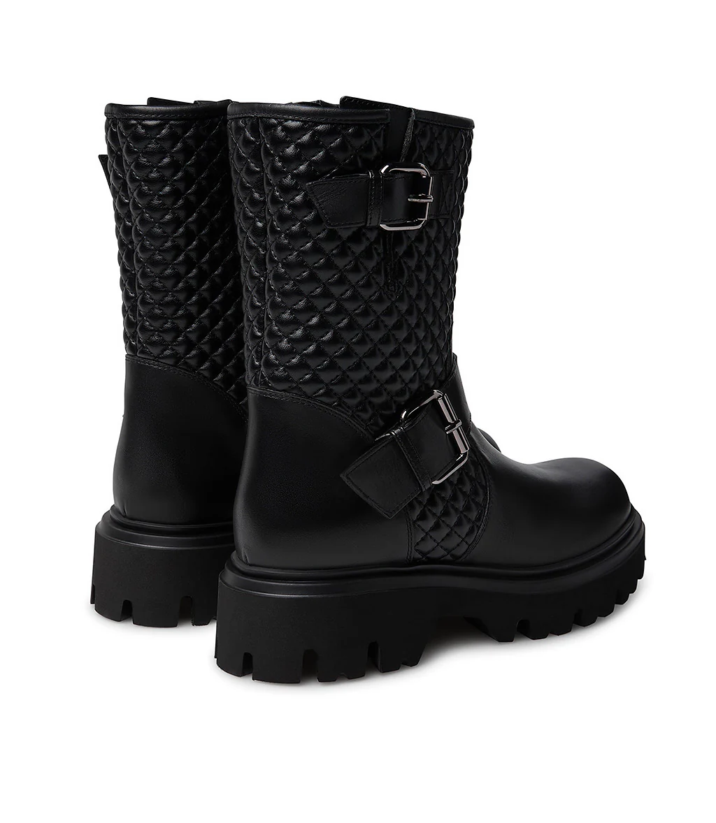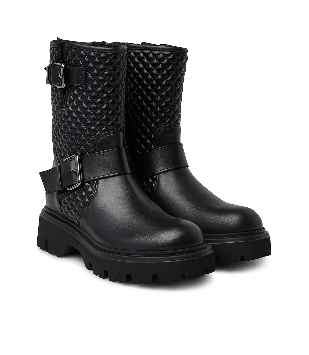 Grintosi e confortevoli, i nostri stivaletti in vitello nero sono personalizzati dai doppi cinturini con fibbie argentate, dal motivo matelassé sul gambale e dalla suola chunky in gomma carrarmato. Realizzati interamente in Italia, presentano una punta arrotondata e una chiusura laterale con zip. Indossali con i tuoi outfits quotidiani della nuova stagione autunno-inverno.