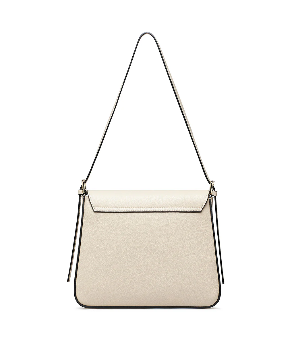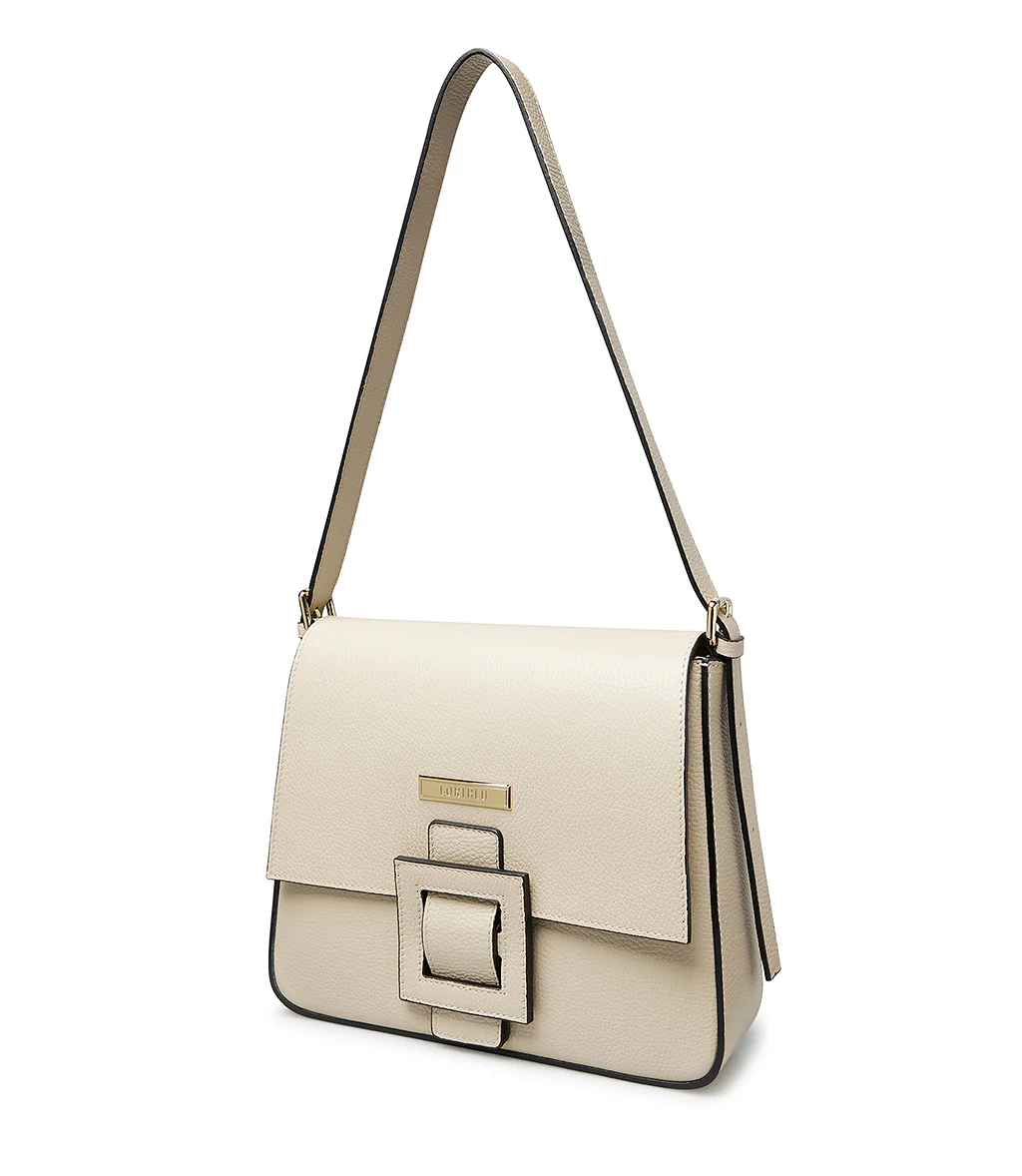 Borsa a tracolla con design a cartella in pelle color cappuccino. Elegante e versatile. Realizzata in pelle martellata nera di alta qualità. Il design squadrato è arricchito da una maxi fibbia tono su tono sul fronte e da una placca metallica con logo inciso che ne esalta lo stile sofisticato. La tracolla regolabile consente di indossarla comodamente sia a spalla che crossbody, rendendola perfetta per il giorno e la sera.