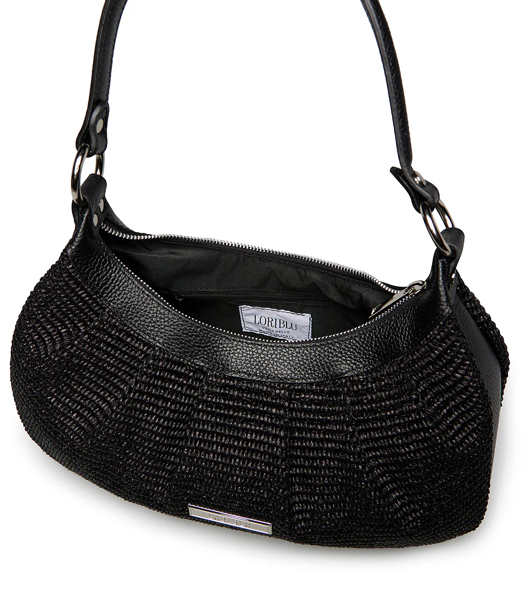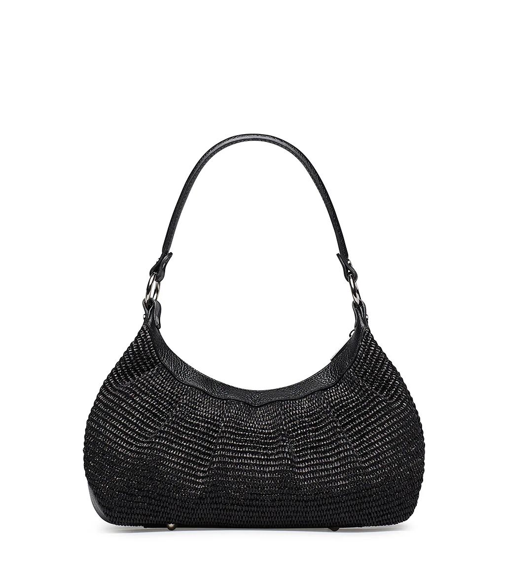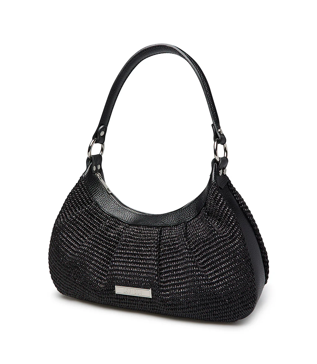 Borsa Hobo in pelle testurizzata e rafia nero con pinces. Zip interna, tracolla rimovibile, logo e dettagli in metallo argento. Le pieghe conferiscono morbidezza e una dinamica tridimensionalità a questo accessorio fresco e versatile che si abbina perfettamente alle nostre mule zeppa della nuova collezione primavera estate.