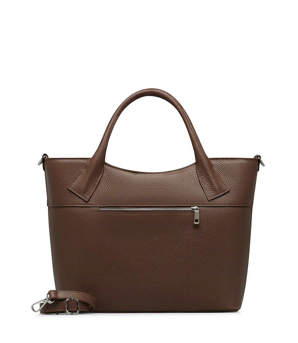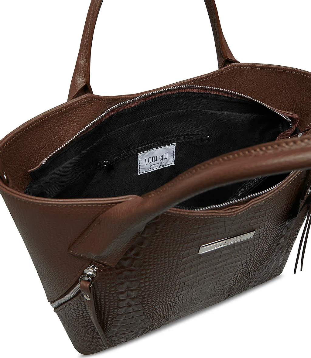 La nostra tote bag cuoio si fa notare grazie al mix inedito in pelle testurizzata e pelle stampa cocco. Capiente ed elegante, rivela due manici superiori, zip trasversali, tracolla regolabile e rimovibile, chiusura con zip e iconica placca-logo frontale in metallo argentato. Perfetta da abbinare ai tuoi nuovi outfits da lavoro.