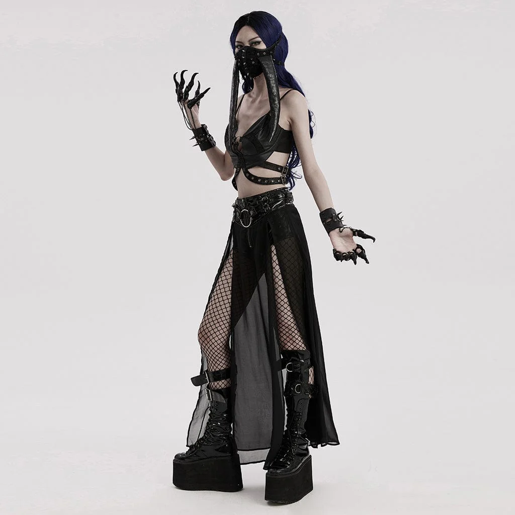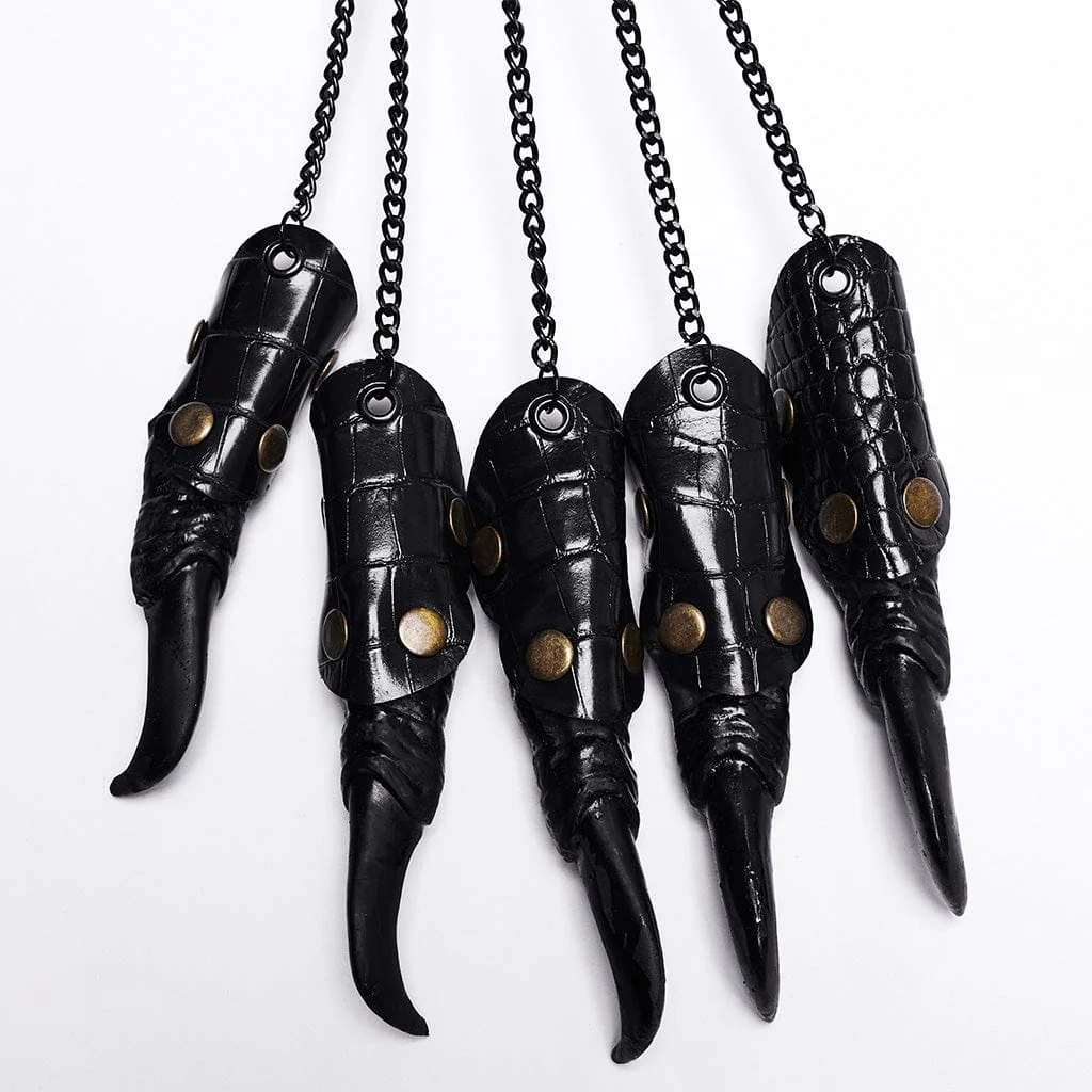 È realizzato in finta pelle. Alla radice del dito è presente un elastico che può essere indossato in modo flessibile. Cucitura in pelle al polso con chiodo a cono a punta pagoda. Le catene collegano il polso e le dita.