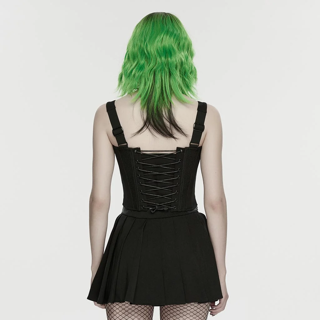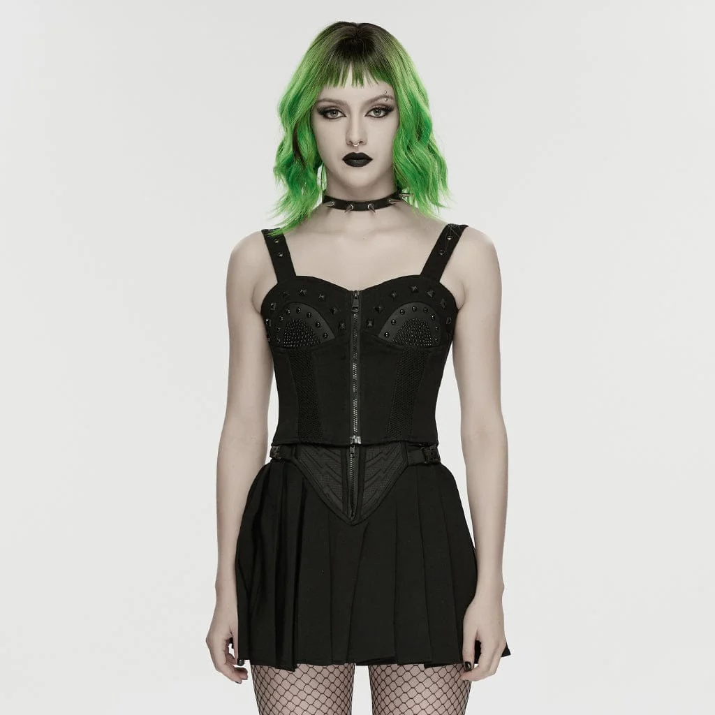 Il bustier da donna con cerniera e borchie Cyberpunk Eyelet è un capo di punta per i guardaroba cyber punk e alternativi, con dettagli audaci che richiamano un’audace atmosfera gotica grunge. Presenta una chiusura frontale con zip, occhielli metallici e dettagli borchiati per un distintivo tocco gotico militare, oltre a spalline regolabili per una vestibilità su misura.