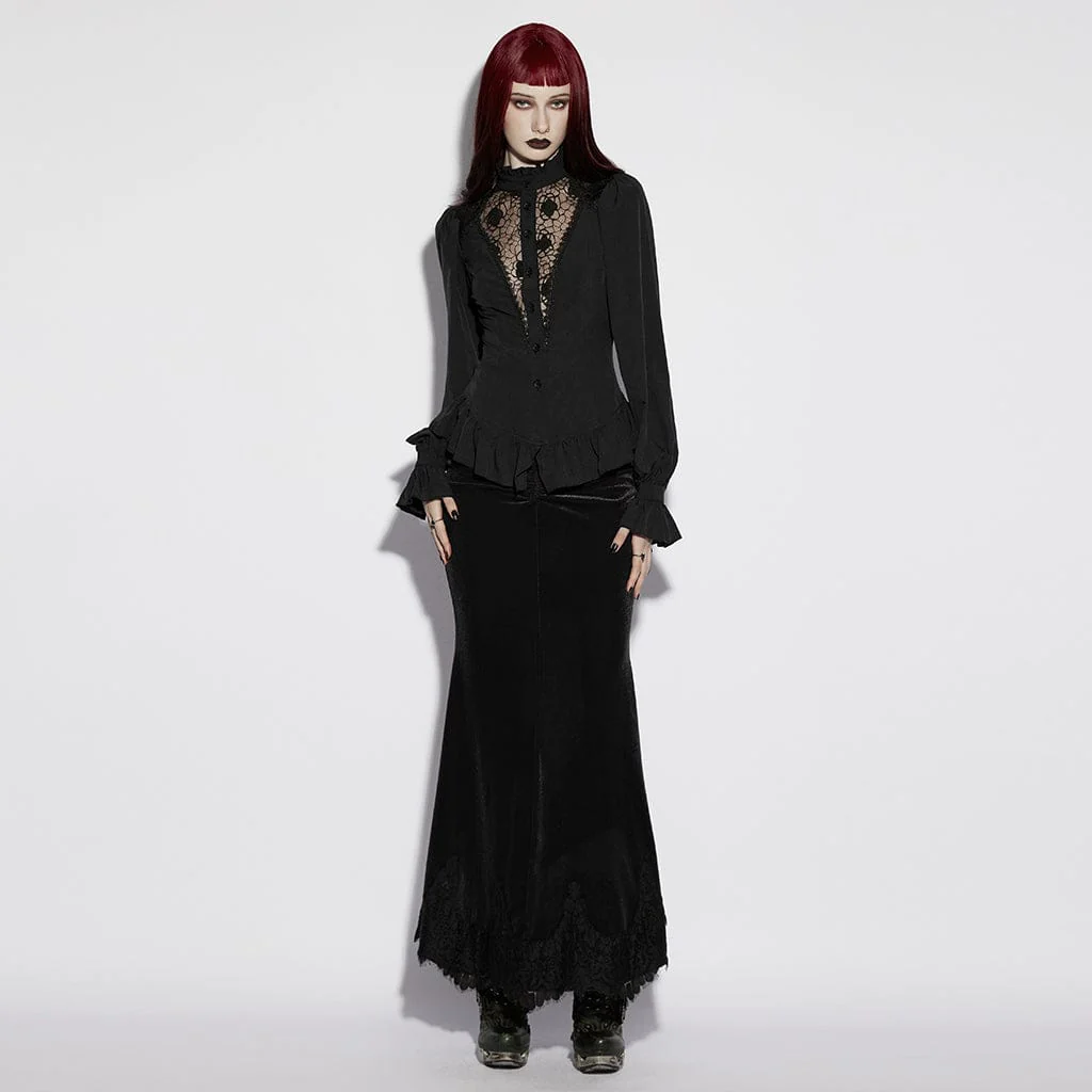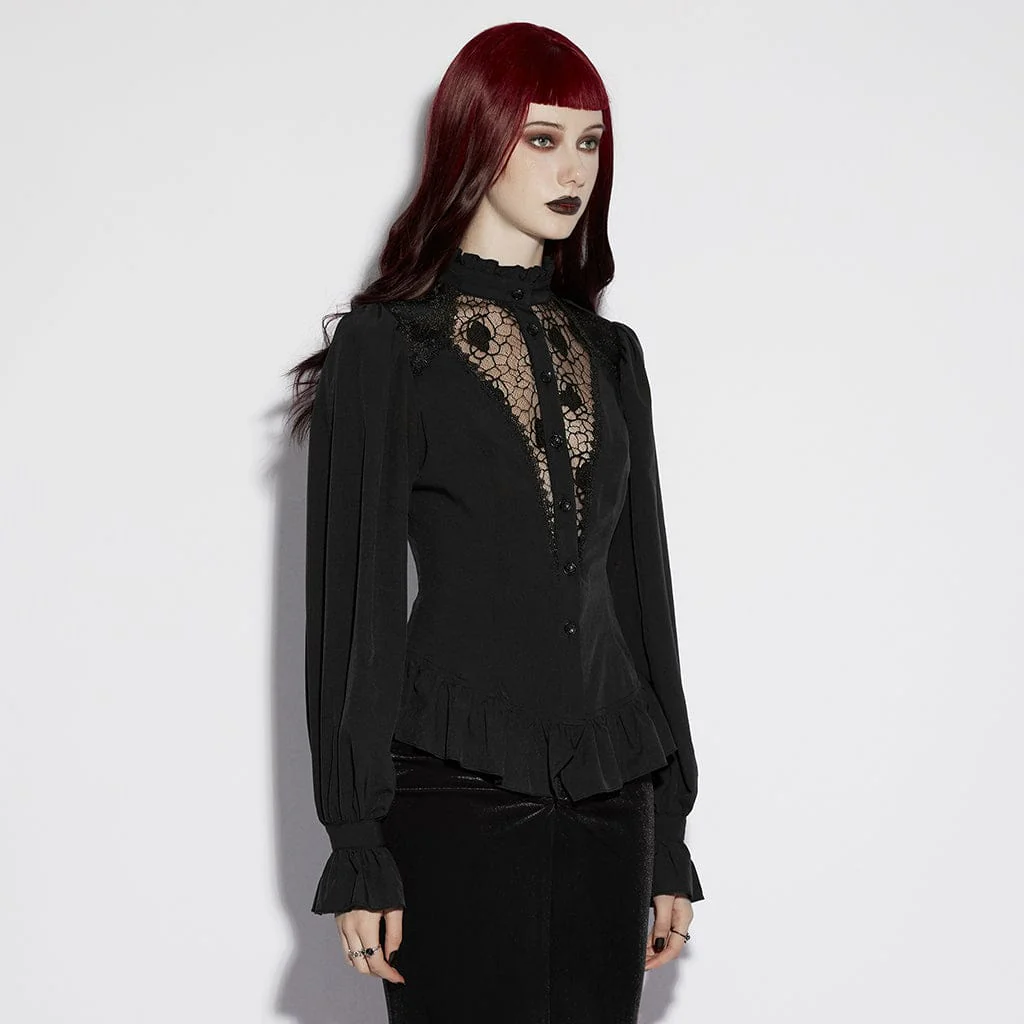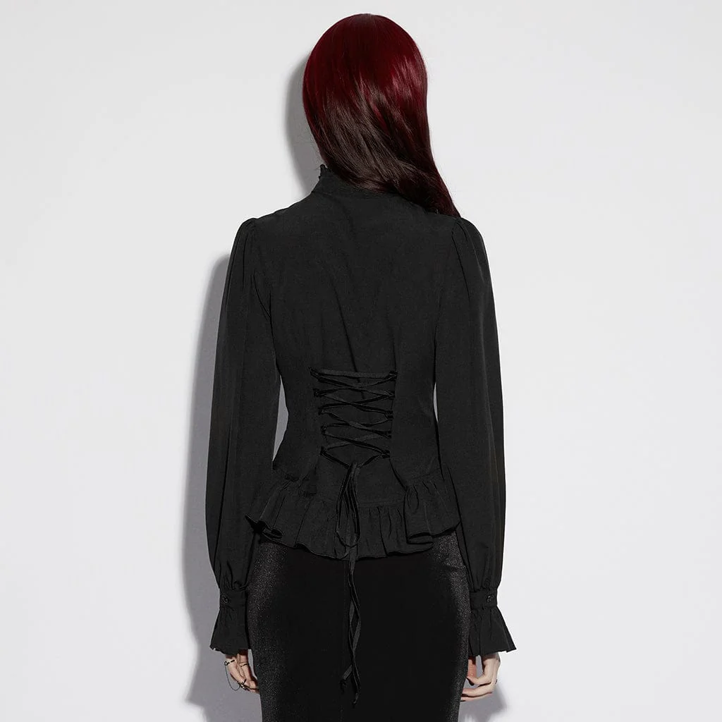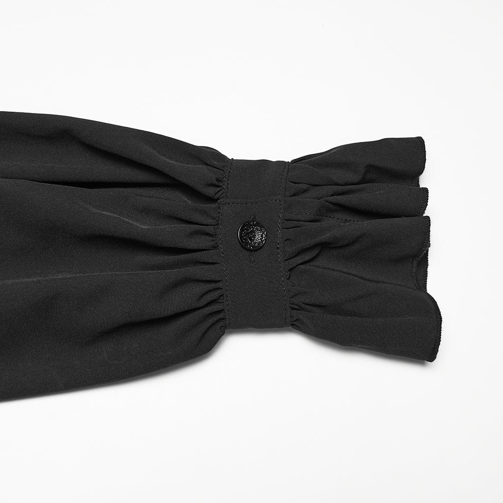 La camicia a maniche lunghe con volant e sbuffo in stile gotico da donna è un capo essenziale per i guardaroba gotici e alternativi, che unisce romantici volant a dettagli scuri di ispirazione vintage. Il colletto alto con volant incornicia un pannello in pizzo trasparente sul davanti, mentre le maniche a sbuffo con polsini arricciati incarnano l’eleganza gotica vittoriana. Sul retro, un dettaglio con lacci sottolinea la silhouette aderente per un tocco sartoriale in stile gotico-vampiro.