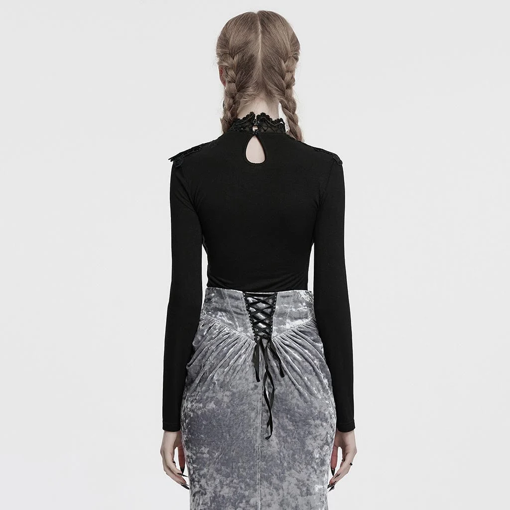 Abbinalo a un choker in pizzo, trucco dark e stivaletti per un look da vampiro gotico completo, oppure abbinalo a un completo gothic lolita e guanti in pizzo per uno stile più delicato. La camicia da donna con scollo a cappuccio in stile gotico e giunture in pizzo è la combinazione perfetta di comfort, stile ed eleganza gotica.