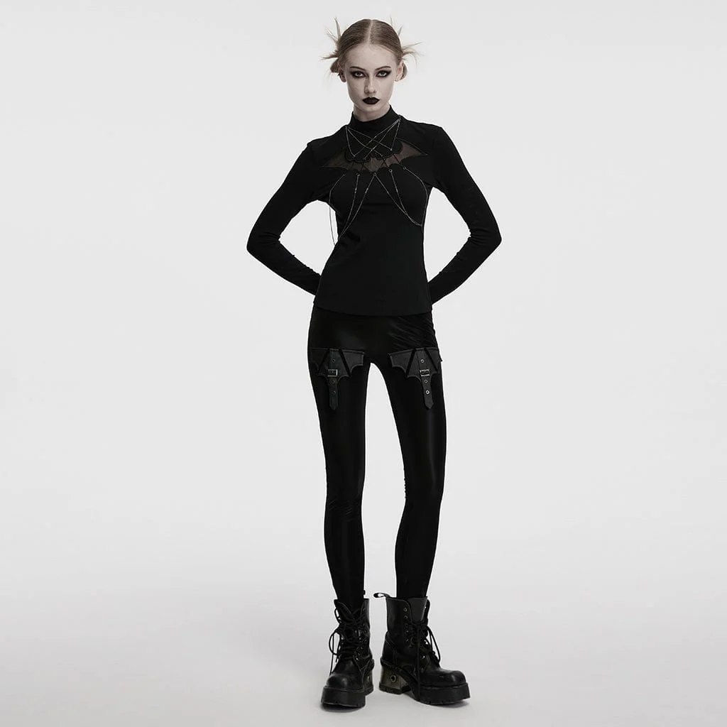 Il design a rete a pipistrello di ispirazione gotica sul davanti aggiunge un tocco unico a questa camicia già di per sé accattivante. Le catene che scorrono dalle ali di pipistrello creano un effetto intricato e audace, mentre il colletto alto le conferisce un look deciso e definito. Le maniche lunghe e aderenti esaltano ulteriormente lo stile elegante e alternativo dell’abito. Inoltre, la cerniera sul retro permette di indossarlo facilmente, completando il look con una finitura moderna e audace.