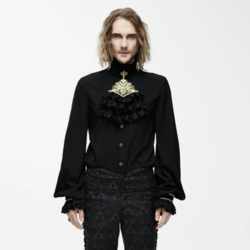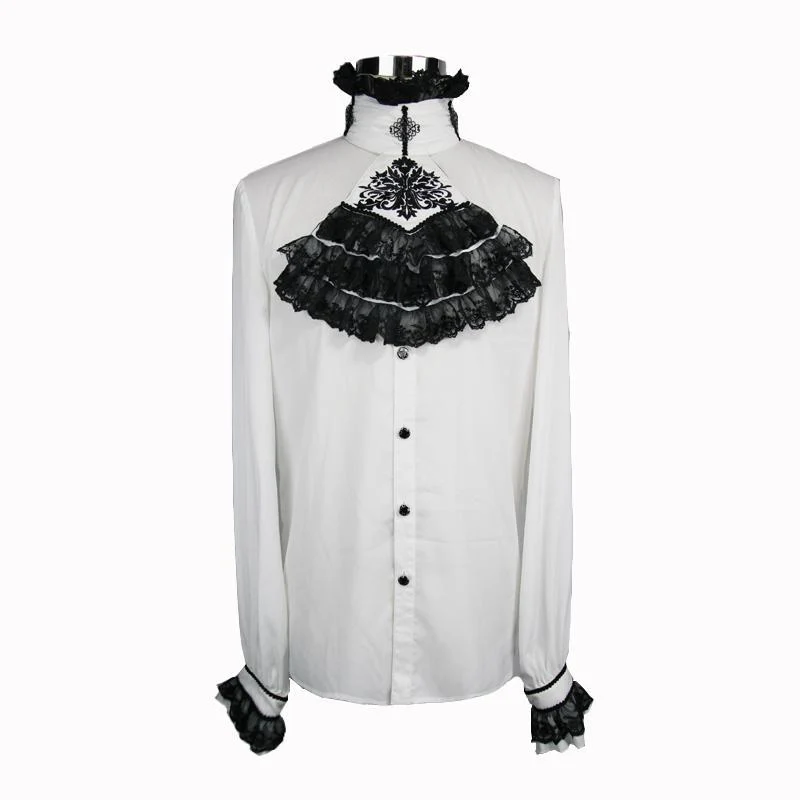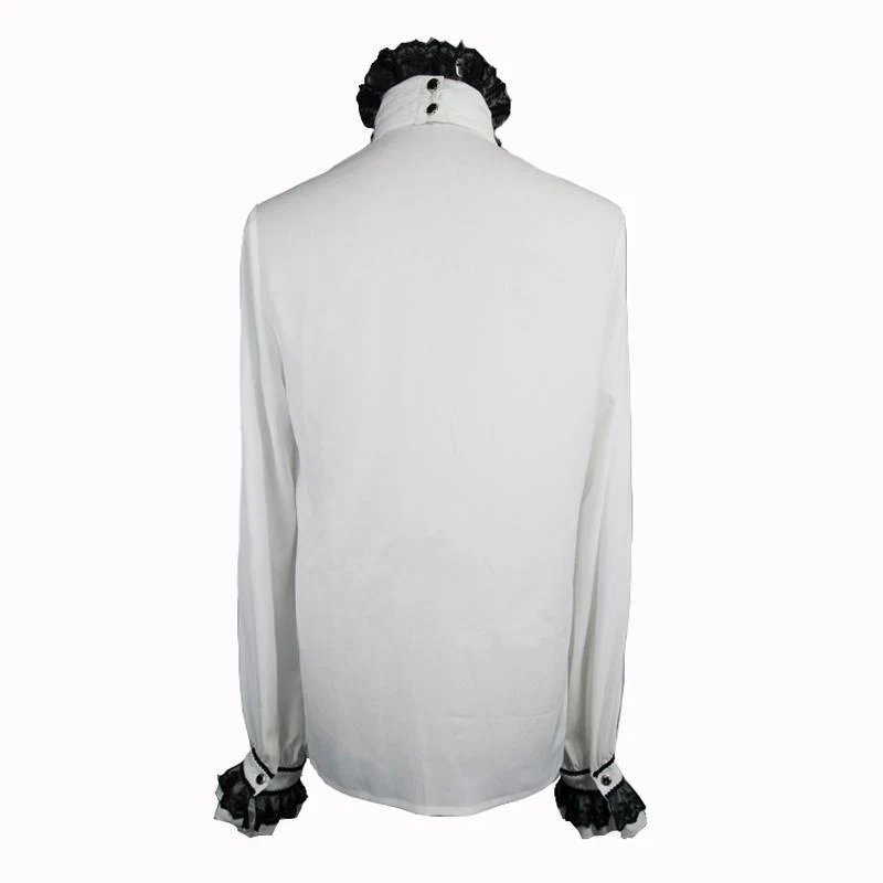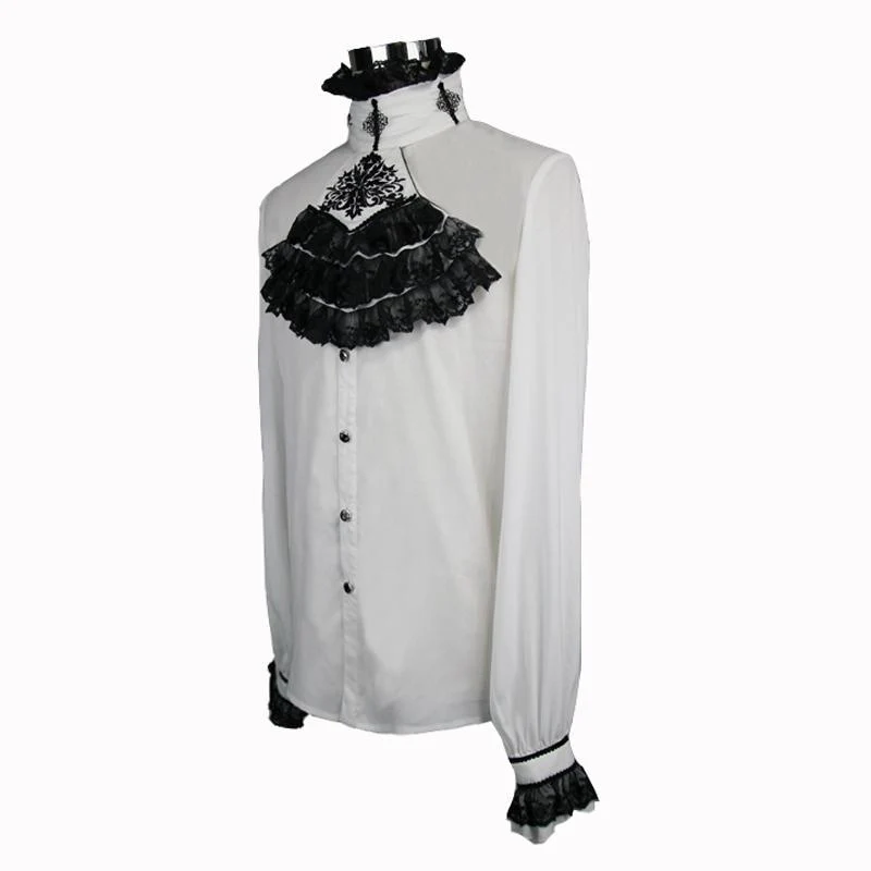 Descrizione: Questa camicia elegante ha uno stile semplice che è impreziosito da un elaborato jabot e fascia da collo. La camicia aperta davanti è tempestata di bottoni ornamentali dorati e neri. Le maniche a palloncino pieno sono raccolte al polso e fissate con una fascia intrecciata bordata di volant in pizzo.
