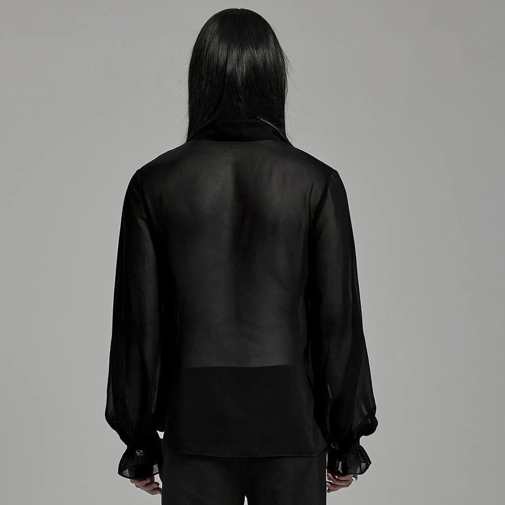 Abbina questa squisita camicia a pantaloni su misura, stivali di pelle e accessori decorati per un completo gotico completo che trasuda sicurezza e individualità. Abbraccia l’eleganza oscura della moda gotica con questa splendida camicia che combina maniche romantiche, dettagli con lacci e tessuto in chiffon trasparente per creare un look accattivante e sofisticato.
