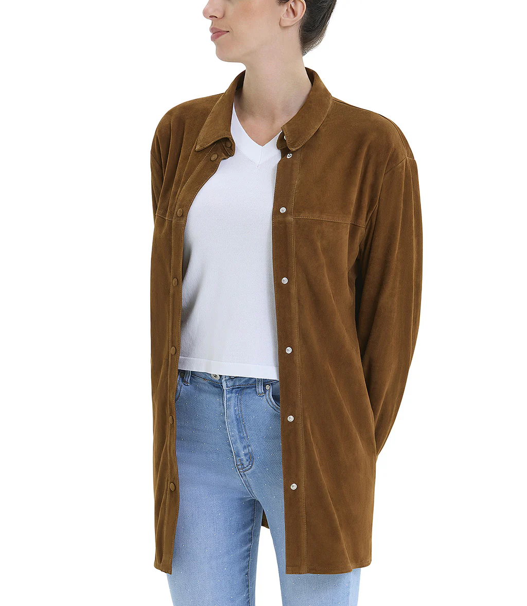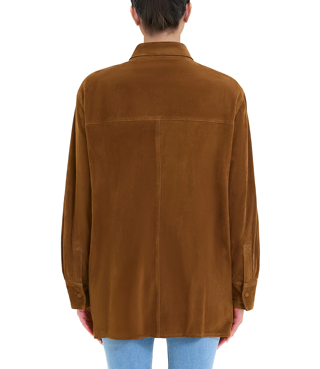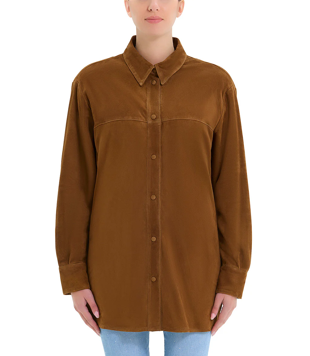 Camicia in pelle scamosciata cuoio, chiusura con automatici