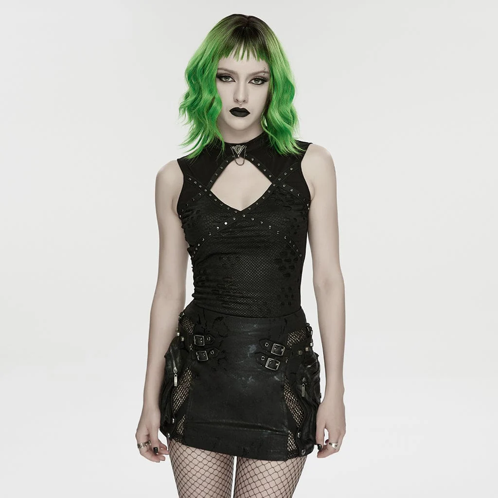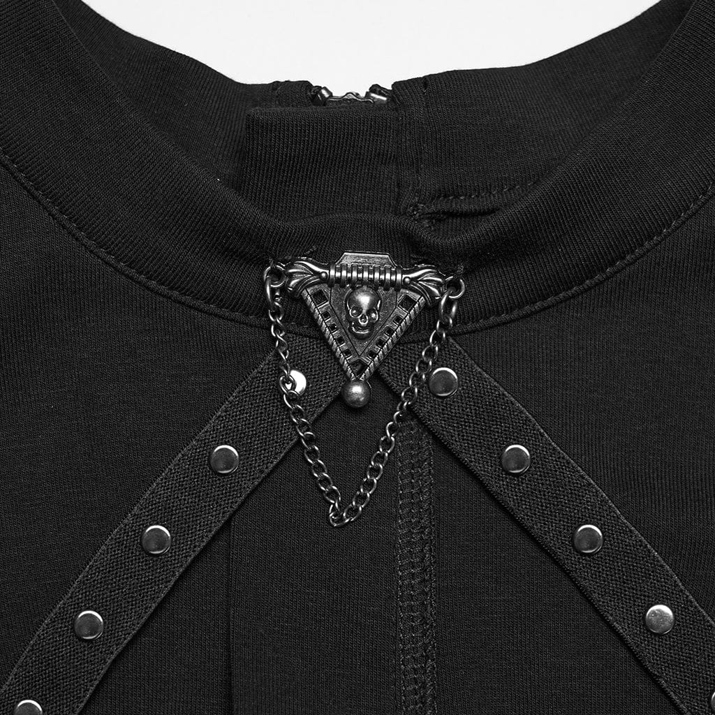 Decorazioni metalliche a forma di teschio triangolare sulla scollatura abbinate a dettagli a catena: è come cucire l’energia ribelle di uno spettacolo rock underground nella canotta, e puoi sentire la punta tagliente dello spirito punk nel momento in cui abbassi la testa.