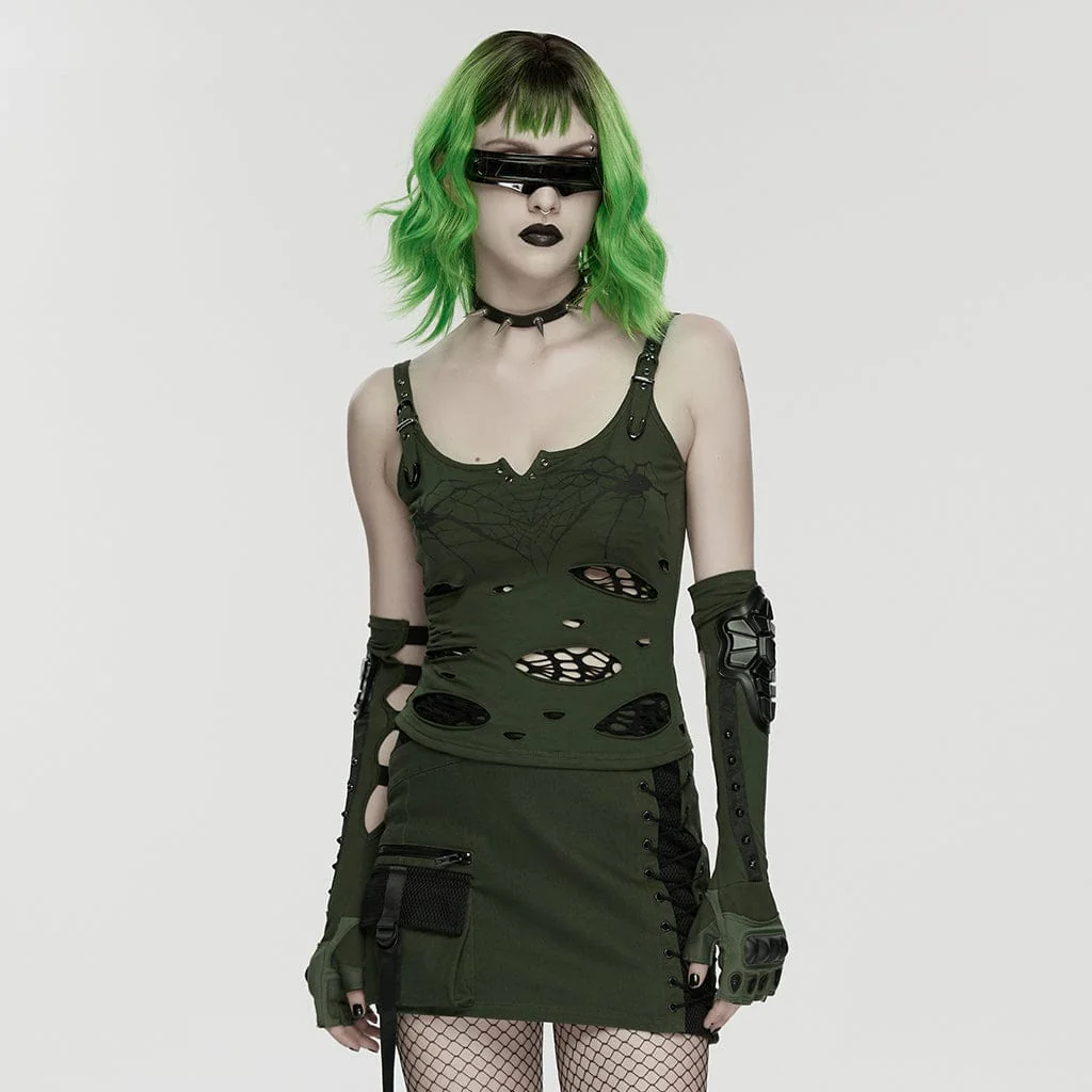 Il design si basa su dettagli audaci e rovinati: tagli strappati (foderati in mesh trasparente) si estendono lungo il busto, aggiungendo una texture provocante che strizza l’occhio all’energia senza filtri del cyberpunk. Le spalline regolabili (rifinite con eleganti elementi metallici) aggiungono un tocco di praticità steampunk, permettendoti di adattare la vestibilità al tuo stile, che tu preferisca la ribellione retrò del rockabilly o il tocco futuristico del cyberpunk.