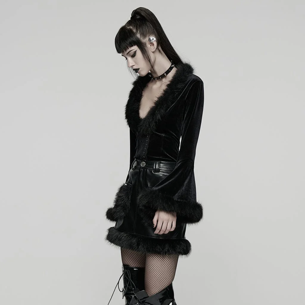 Le decorazioni in pelliccia sintetica su scollatura e polsini si ispirano ai geni retrò dell’abbigliamento gotico. Attraverso l’incontro tra morbida pelliccia sintetica e velluto, creano un senso rituale misterioso e solenne, esaltando l’atmosfera da “dark romance” gotico.