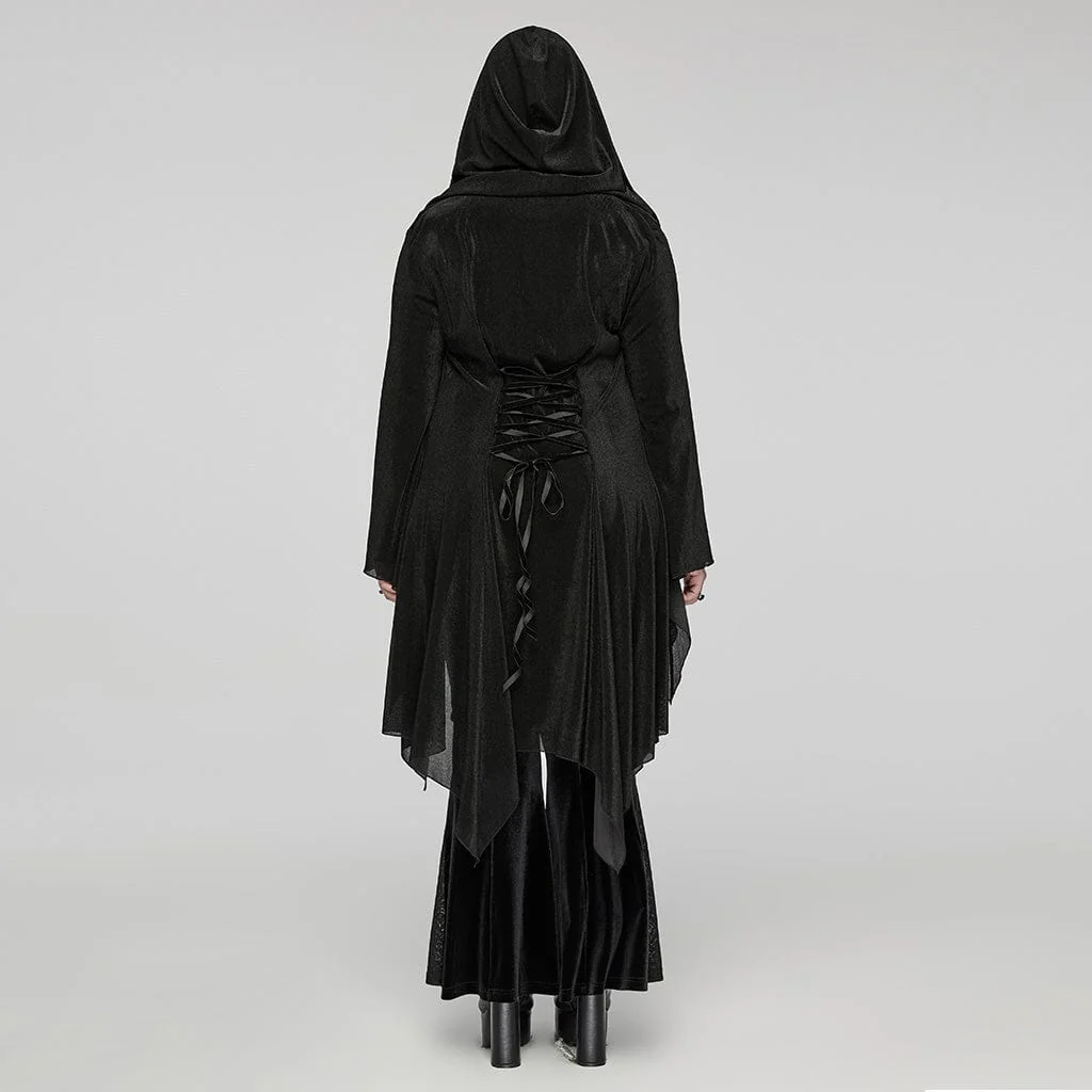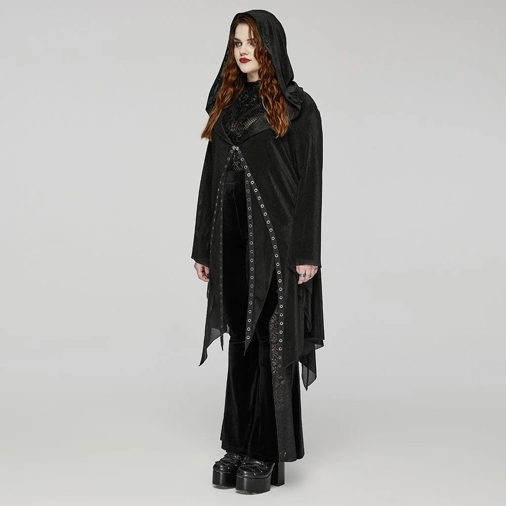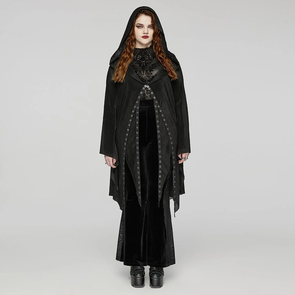 Cardigan da donna in rete gotica con occhielli irregolari con cappuccio, un capo accattivante che unisce dettagli intricati con un tocco di romanticismo oscuro.