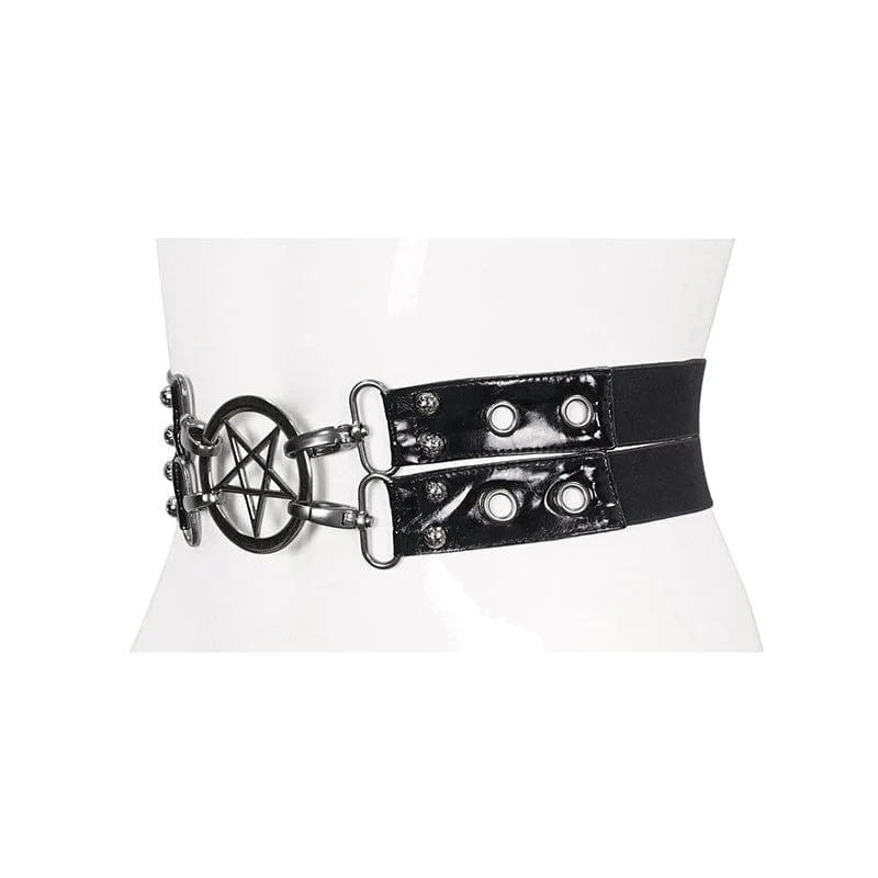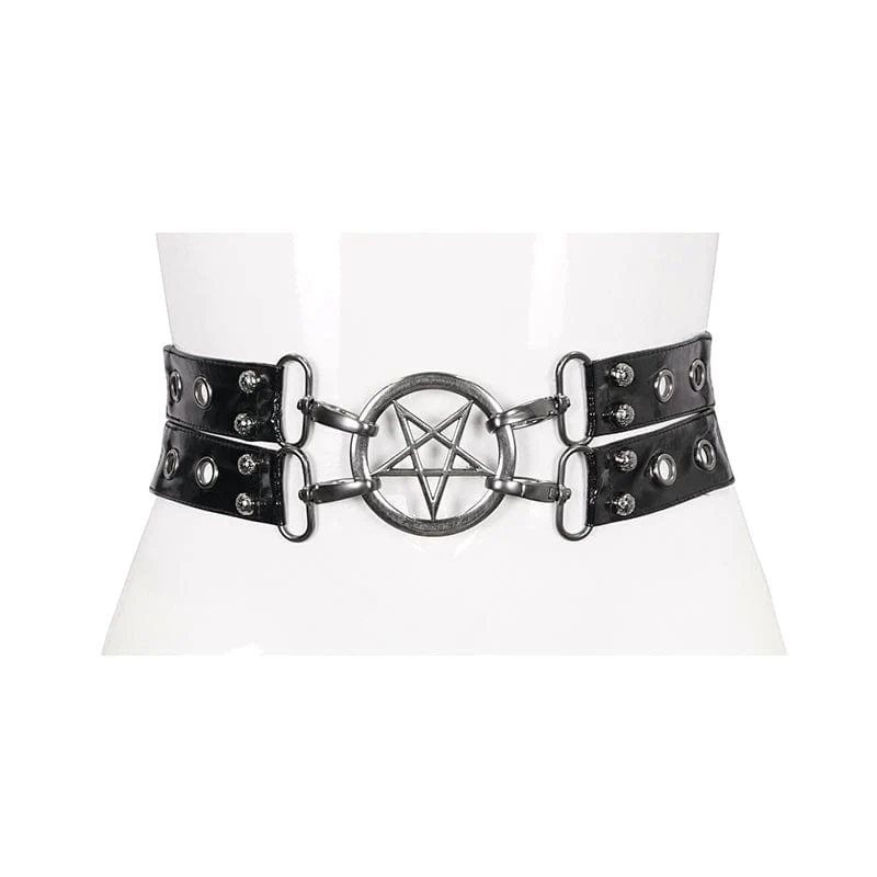 Questa cintura gotica è a doppio strato e realizzata in ecopelle, cinturini in nylon e catena. Consiste in una grande stella a cinque punte al centro. Le cinghie elastiche in nylon sul retro possono essere regolate.