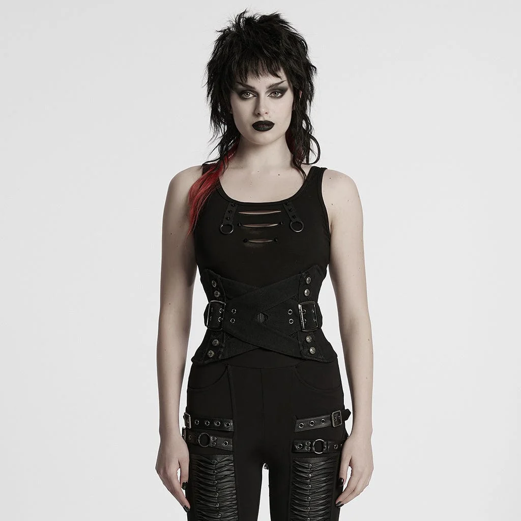 Aggiungi un tocco di stile al tuo guardaroba alternativo con il corsetto sottoseno con lacci e fibbia intrecciata punk da donna. Questo sorprendente capo combina gli elementi feroci del punk goth e della moda gotica, rendendolo l’accessorio perfetto per qualsiasi outfit audace. Il corsetto è progettato con una combinazione di tessuto twill, tessuto intrecciato a brandelli e rete per un look strutturato unico che aggiunge dimensione e profondità.