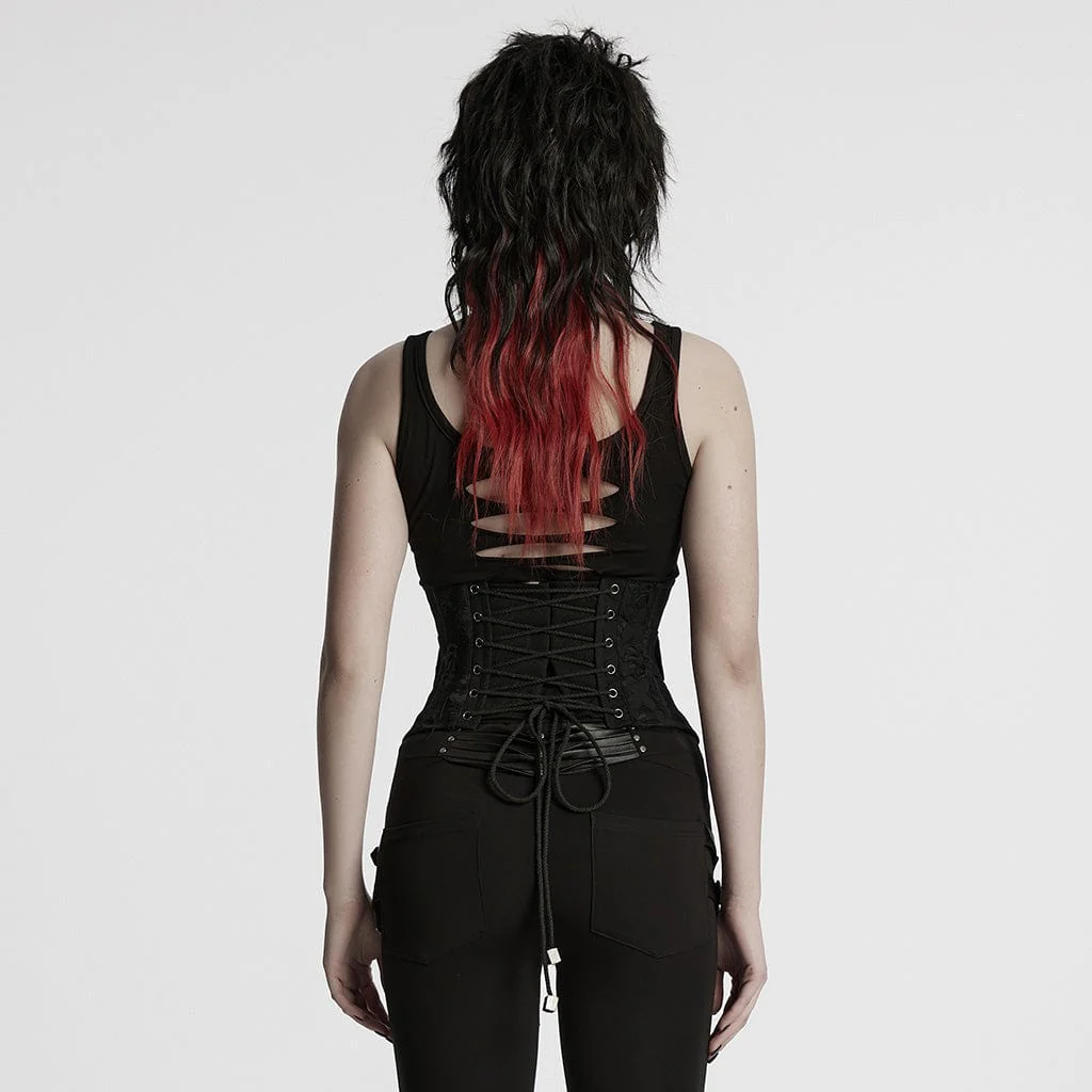 Questo corsetto è un must per gli amanti del punk gotico, dello steampunk e della moda alternativa. Che lo indossi da solo, sopra una camicia o abbinato a una gonna o a dei pantaloni, i dettagli punk rock, tra cui i cordoncini con la punta a forma di teschio, assicurano che questo capo si distingua ovunque tu vada.