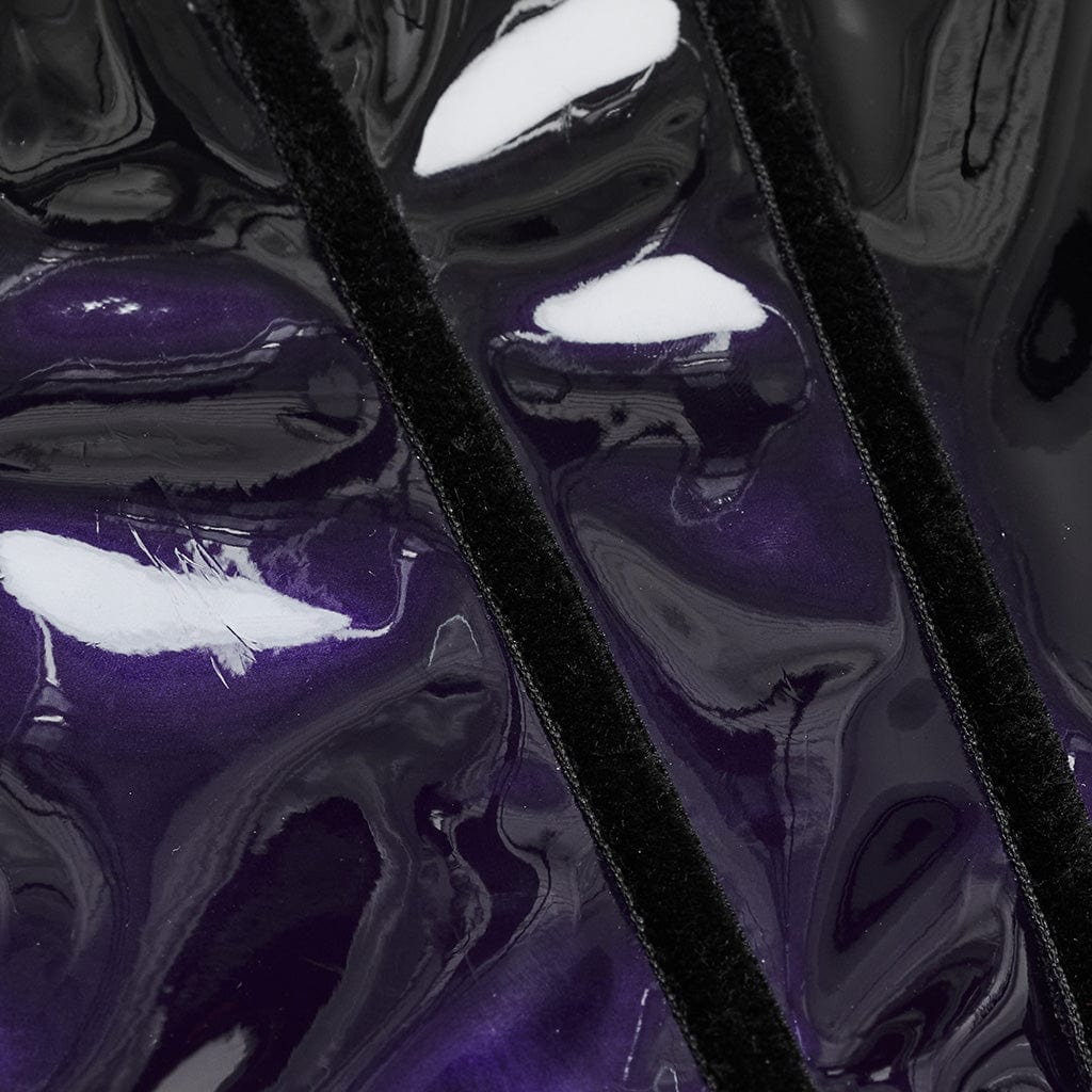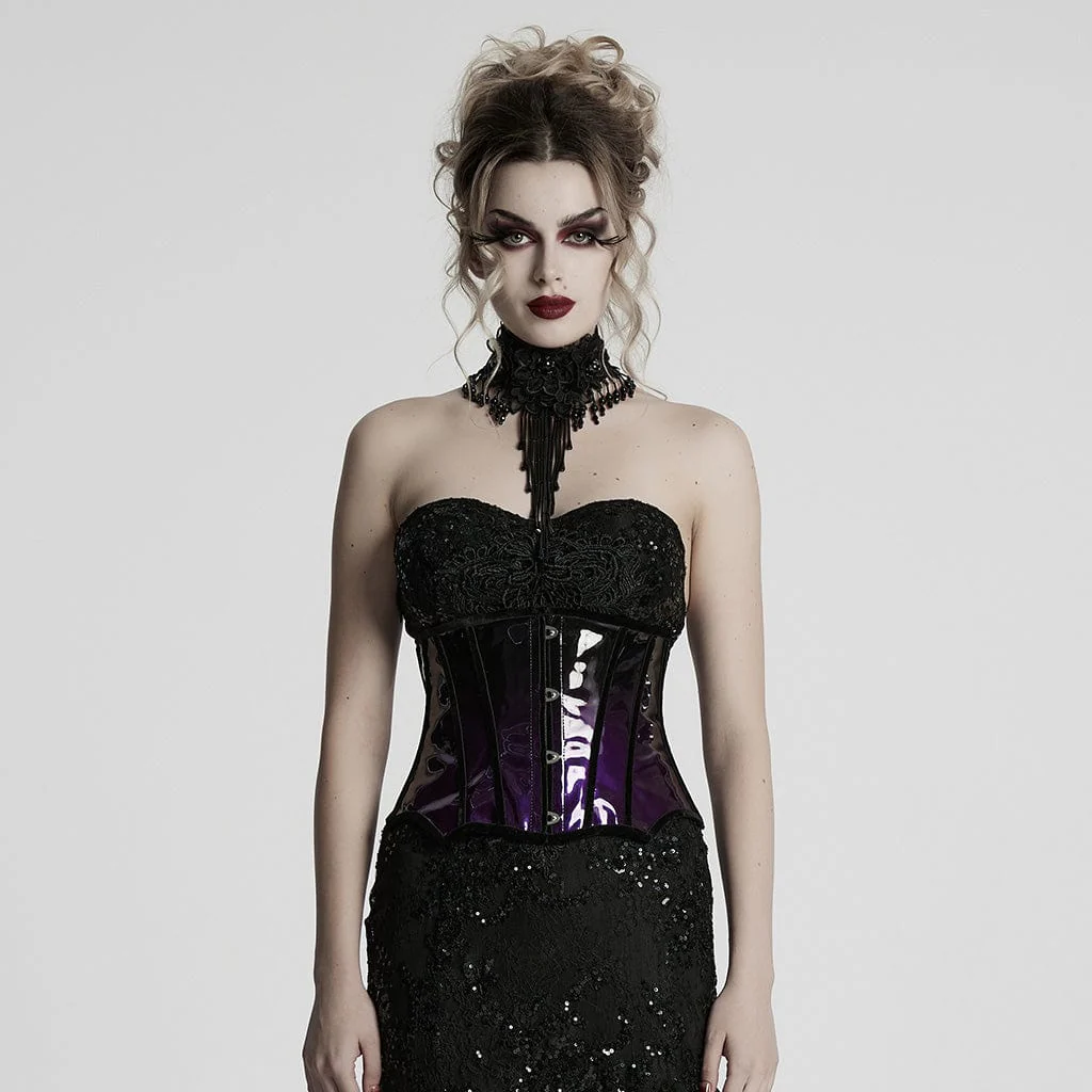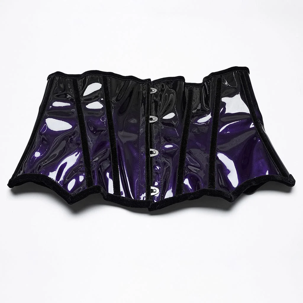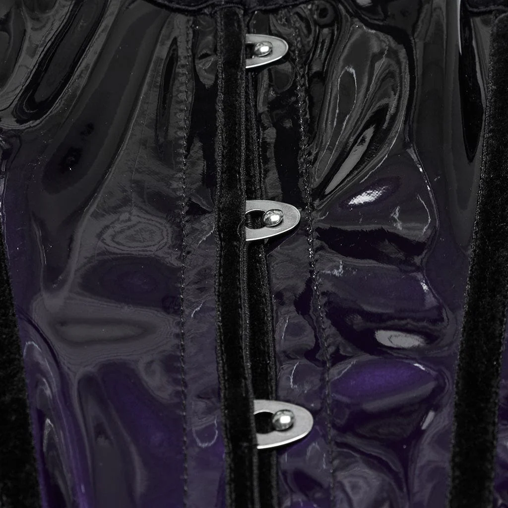 Cattura l’attenzione con questo corsetto sottoseno in vernice gotica a contrasto di colore viola, un’audace fusione di eleganza gotica vittoriana e spirito cyberpunk. Realizzato in pregiata pelle verniciata sfumata, questo straordinario capo presenta una finitura lucida che sfuma in modo fluido dal nero intenso a un elettrizzante viola notte, creando un effetto visivo spettacolare e seducente.
