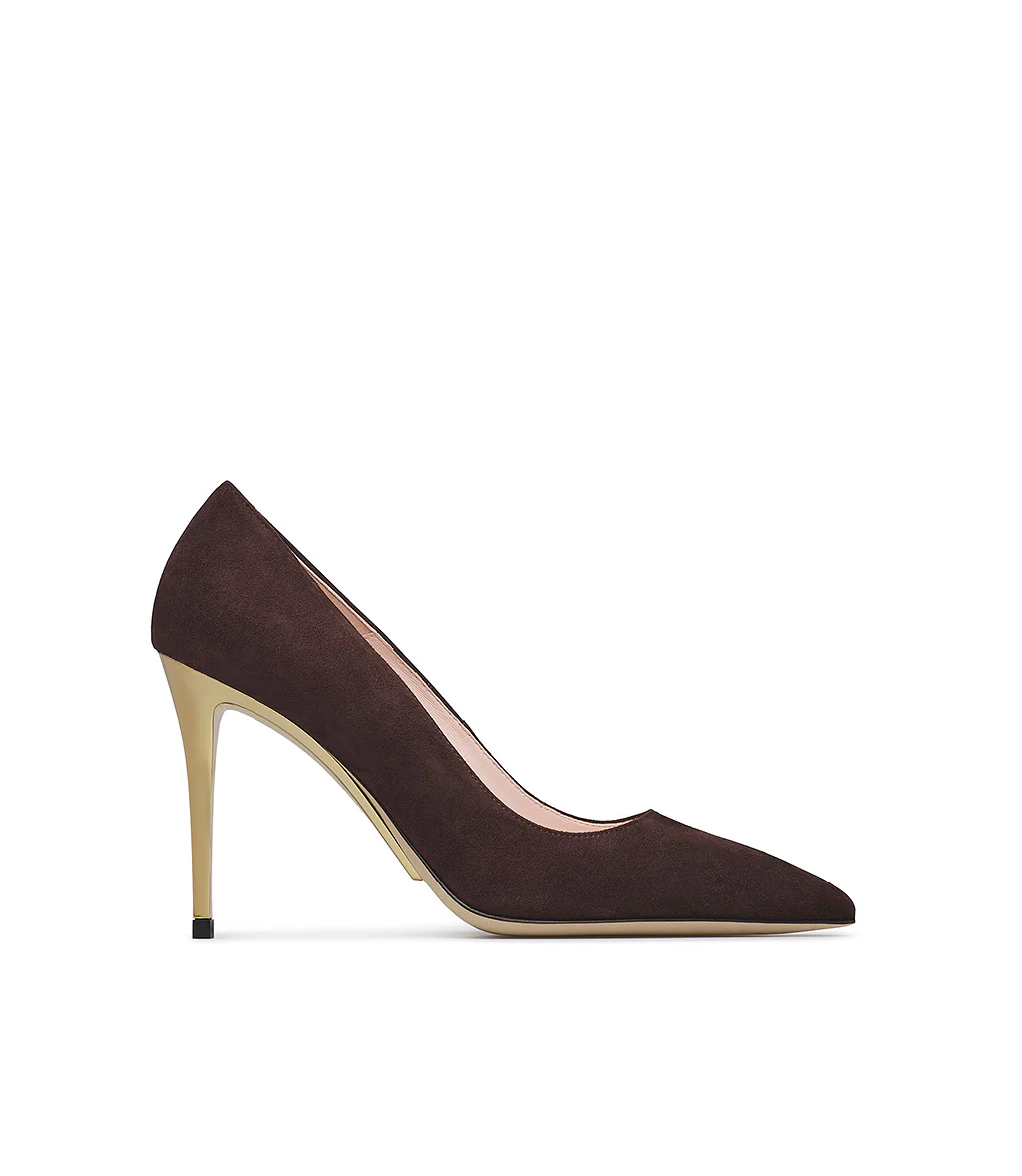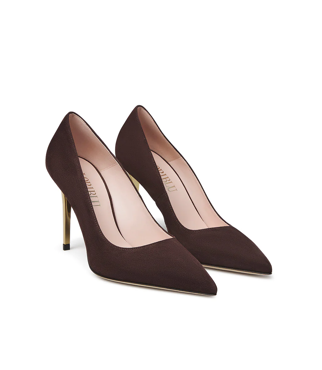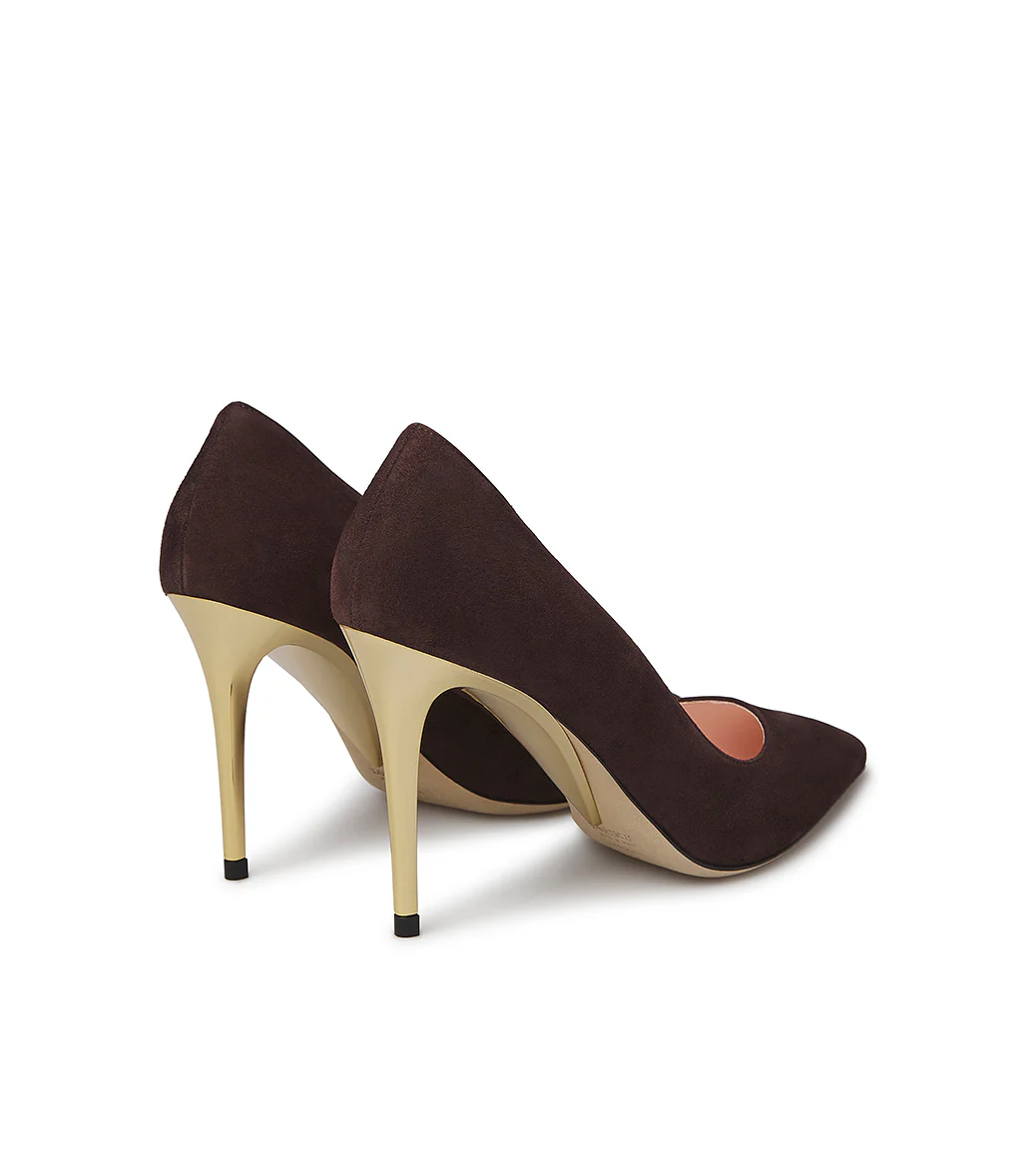 Realizzate in Italia, le nostre décolleté sono eleganti, femminili e senza tempo. Presentano una silhouette in pregiato camoscio marrone, spiccano grazie al tacco scultura in metallo dorato ed alla silhouette raffinata. Punta sfilata e suola in cuoio naturale, è l’accessorio perfetto da abbinare ai tuoi outfit eleganti.