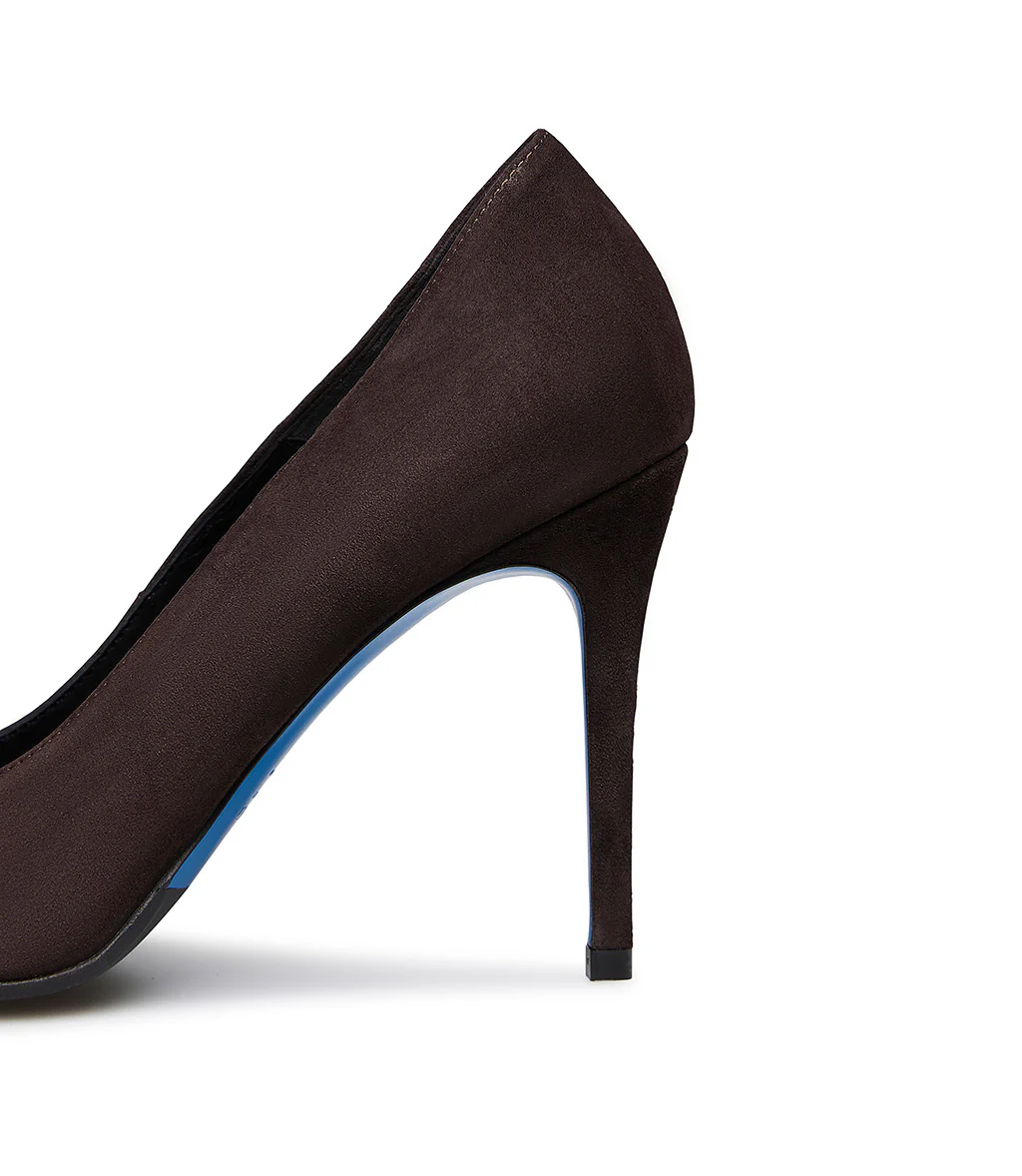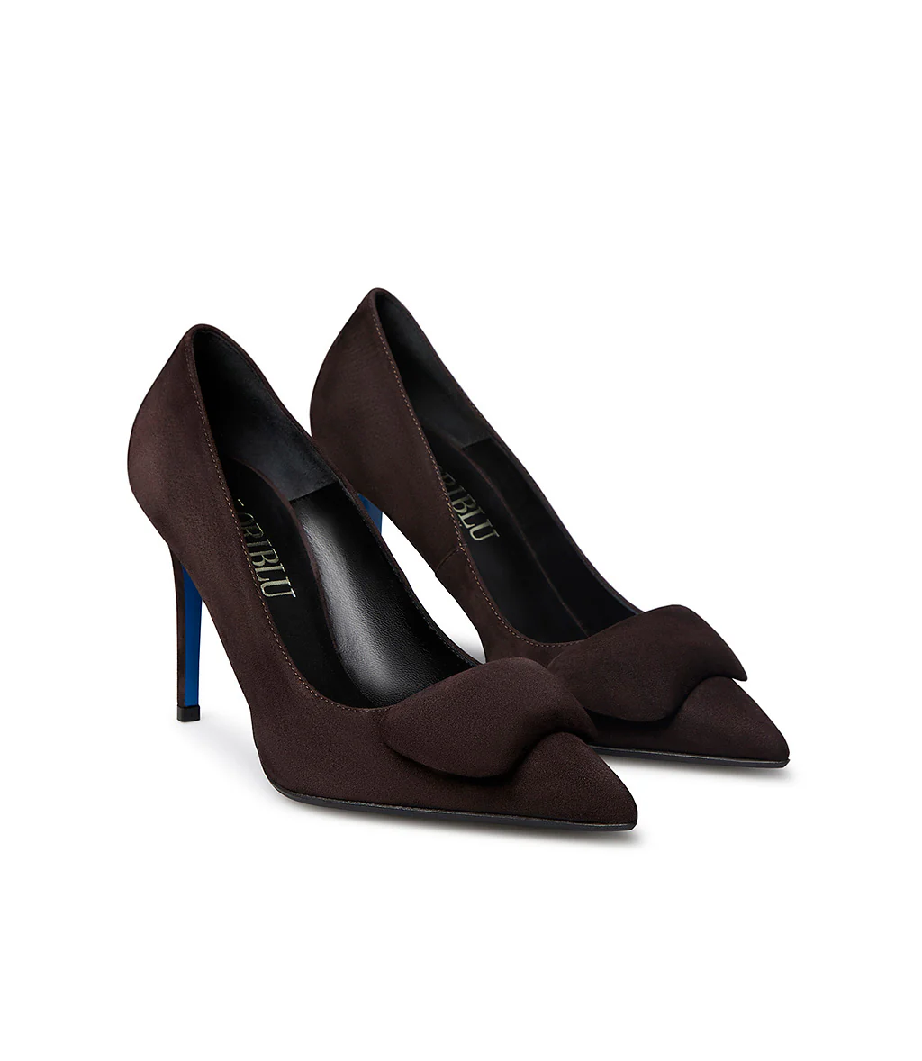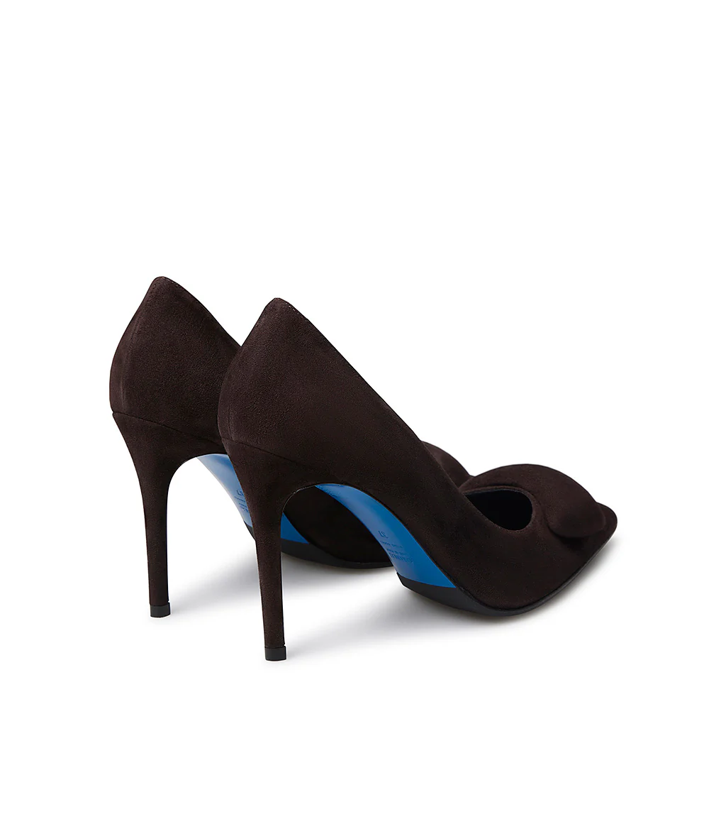 Quintessenza della femminilità, le décolleté non possono mai mancare nel nostro guardaroba. Questo nuovo modello in pregiata pelle scamosciata moro rivela una silhouette affusolata esaltata da un elegante dettaglio di design sulla tomaia. un comodo tacco a spillo e la nostra iconica suola in cuoio blu completa il modello. Perfette da indossare sia di giorno che di sera.