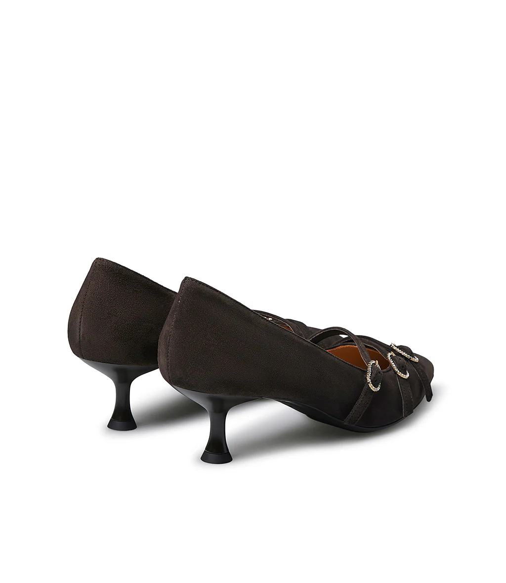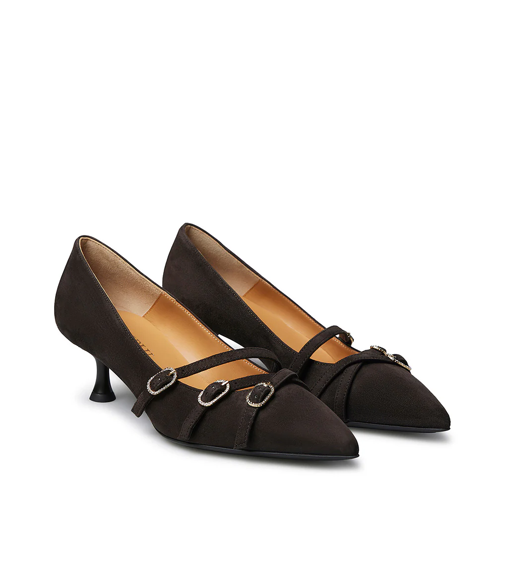 Sinonimo di eleganza questa décolleté è realizzata in camoscio moro con tacco basso, ideale per unire raffinatezza e comodità. Il design è impreziosito da tre cinturini sottili con fibbie dorate decorate da cristalli che donano un tocco luminoso e femminile.