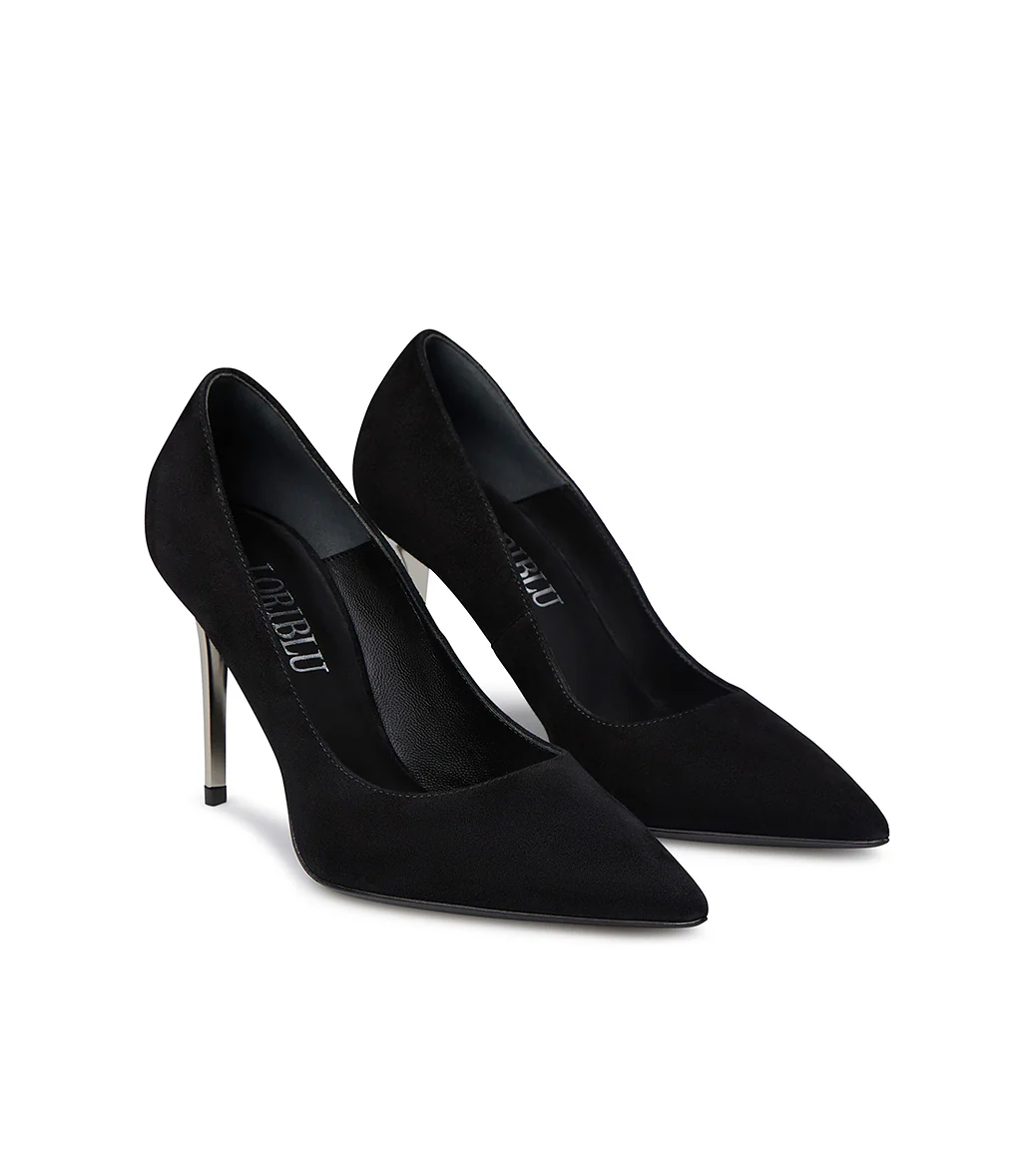 Sofisticate e femminili, le nostre décolleté in pregiato camoscio nero sono perfette per valorizzare il vostro outfit sia di giorno che di sera Sono realizzate con cura in Italia e rivelano una silhouette affusolata, un vertiginoso tacco a spillo di design in metallo argento che si estende sulla nostra distintiva suola in cuoio blu.